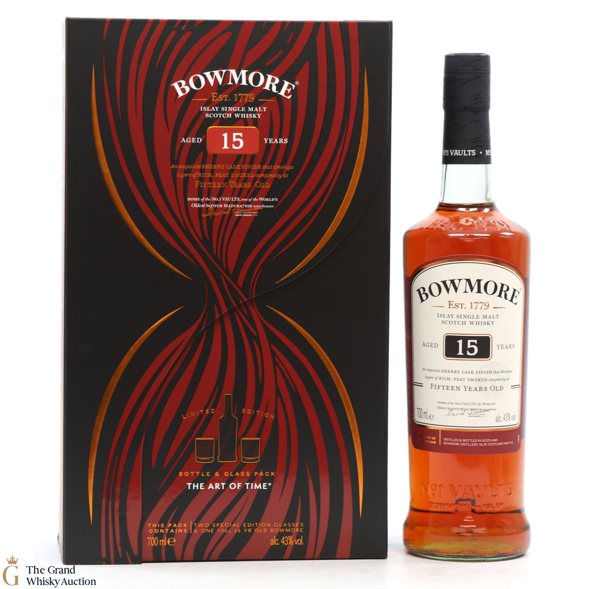 This lot inlcudes 1 x 15-year-old shery cask finished Bowmore and 2 x glasses in this 'Art of Time' giftpack.
