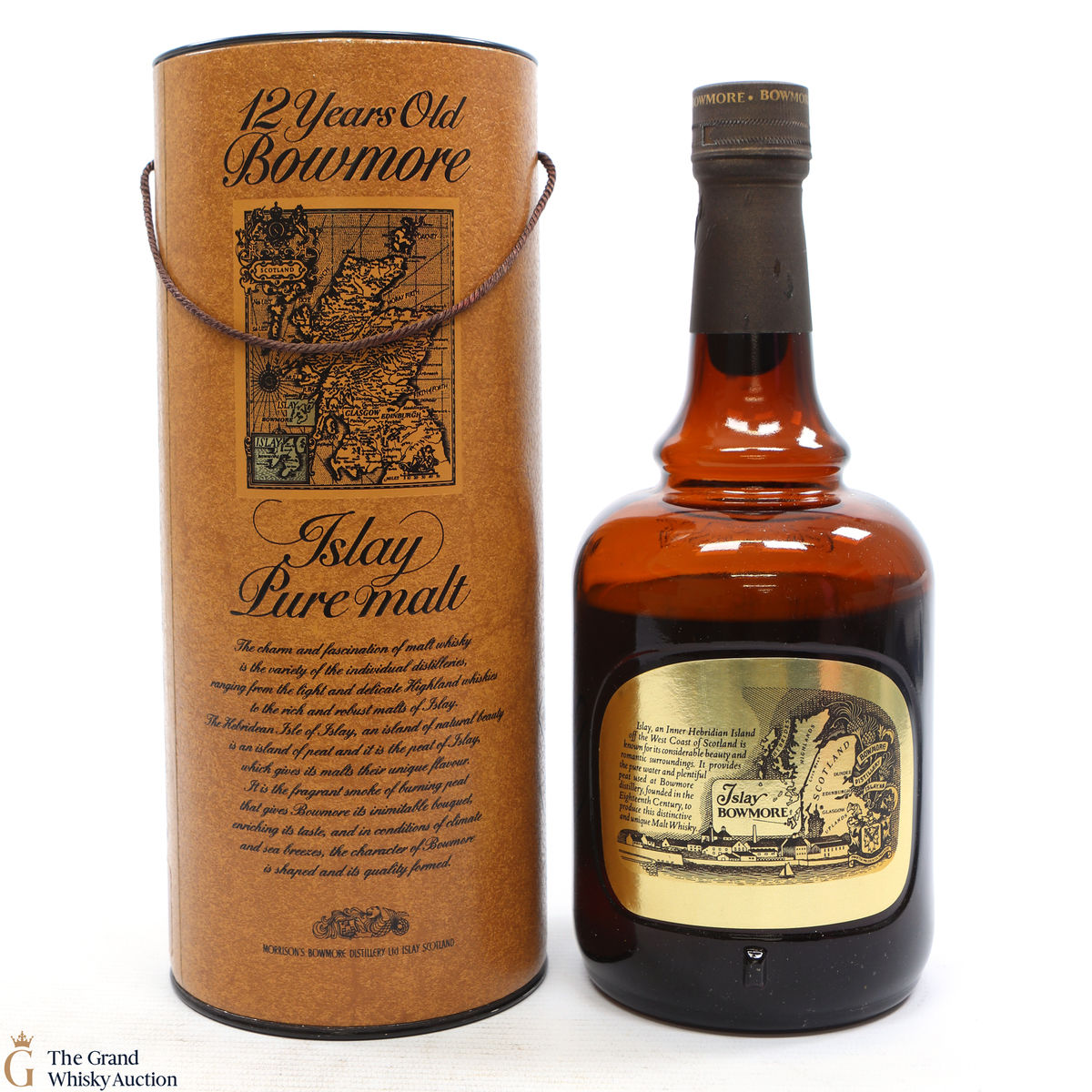 This is an iconic old dumpy style 75cl bottle of Bowmore 12-year-old Bowmore estimated to be from the 1980s. It was bottled when the distillery was Morrison's Bowmore before it was bought over by Suntory in 1989.