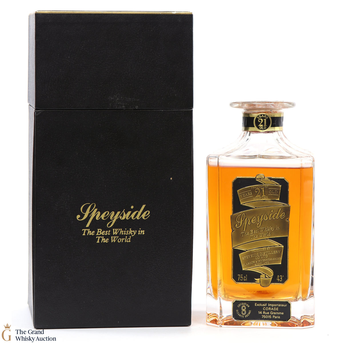 This exclusive 21 year old french import produced by the Speyside Distillery Co is accompanied by a glass stopper.