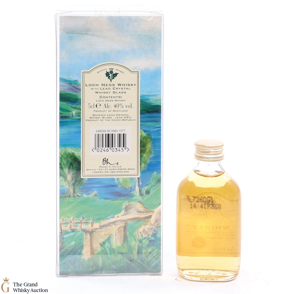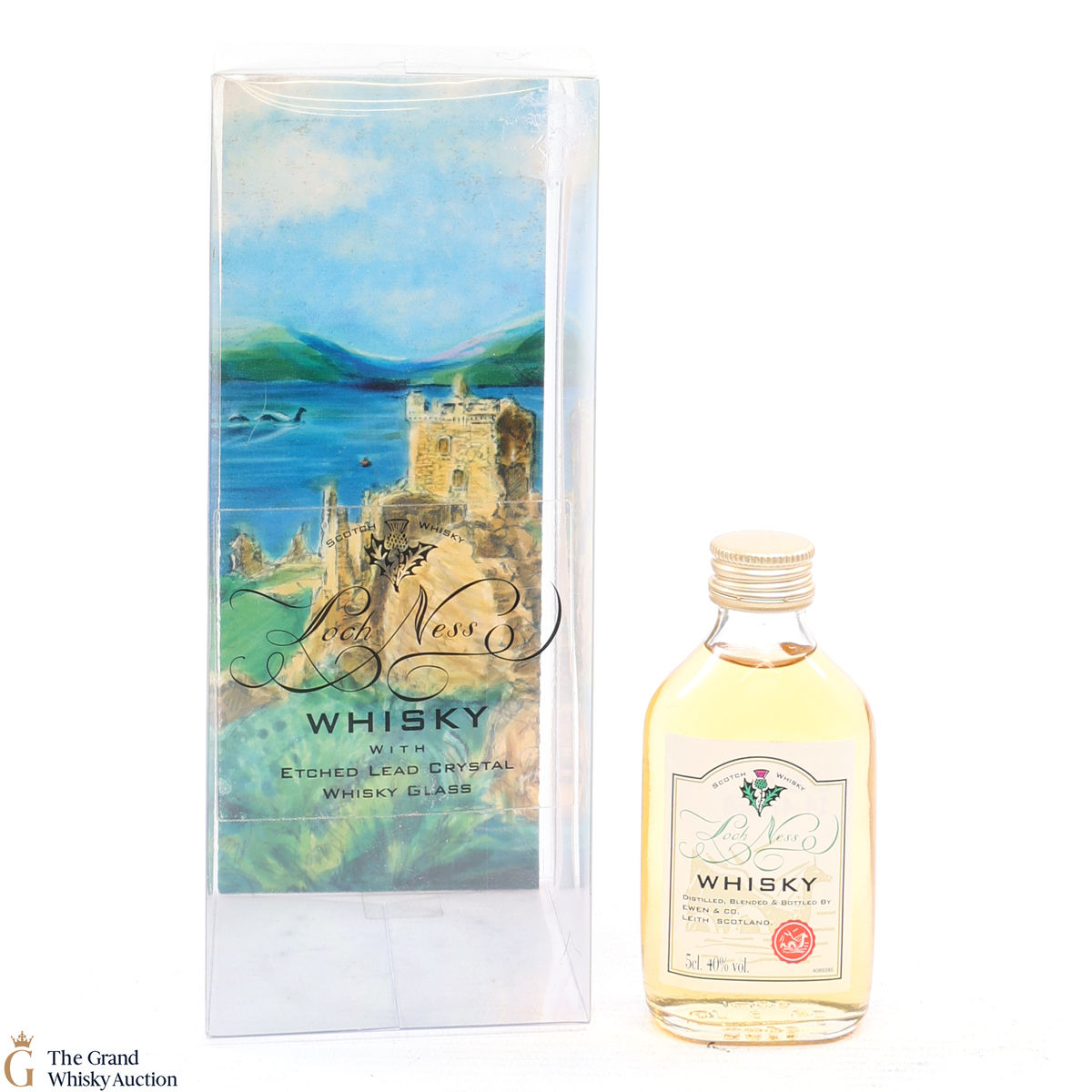 This lot includes a 5cl bottle of Loch Ness blended whisky by Ewen & Co with etched lead crystal whisky glass.
