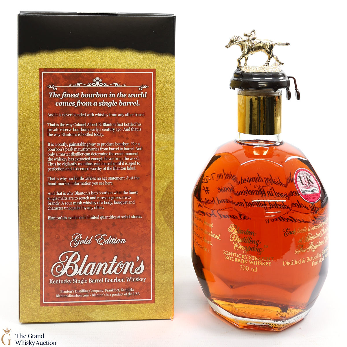 PLEASE NOTE: The wax seal on Blanton's bottles are prone to cracking in transit due to their design. Therefore, as stated in our T&C’s, we do not and will not accept liability should the seal be breached, broken, split or leak in transit. Additionally, please know due to the design of the internal cardboard packaging that surrounds the top of the bottles, it too may be torn. By bidding on this lot you have understood this to be true. Insurance is for complete breakage or loss in transit only.