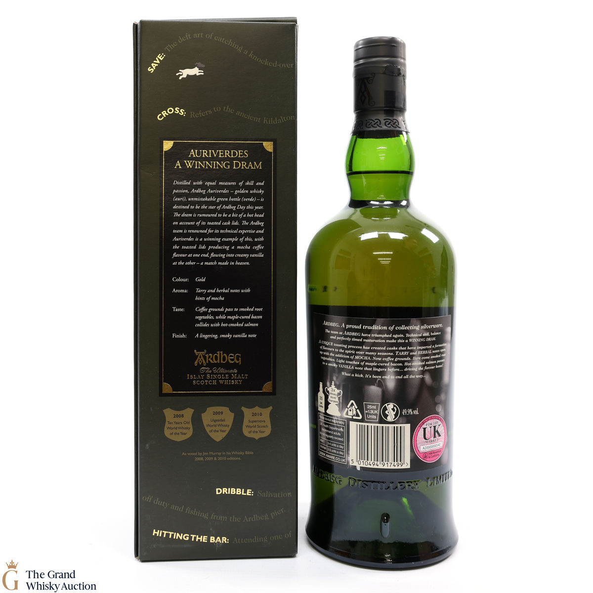 This special edition Ardbeg single malt was released on Ardbeg Day 2014. during Feis Ile. Auri(Gold) verdes (Green) it refers to the golden whisky and the iconic Ardbeg green bottle of Ardbeg whisky. It is said to be a dram of two halves - the whisky uses toasted cask lids to create Mocha Coffee flavours that team up with creamy vanilla.