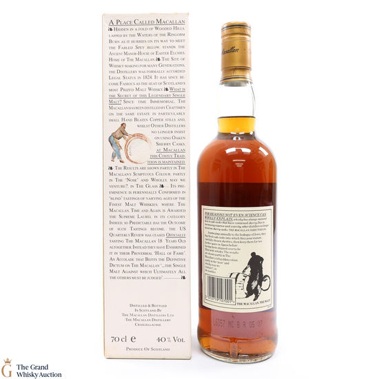 This is an old-style presentation of Macallan 10 Year old was bottled in the 1990's. This classic Speyside malt whisky matured in sherry oak casks from Jerez. Very collectable.