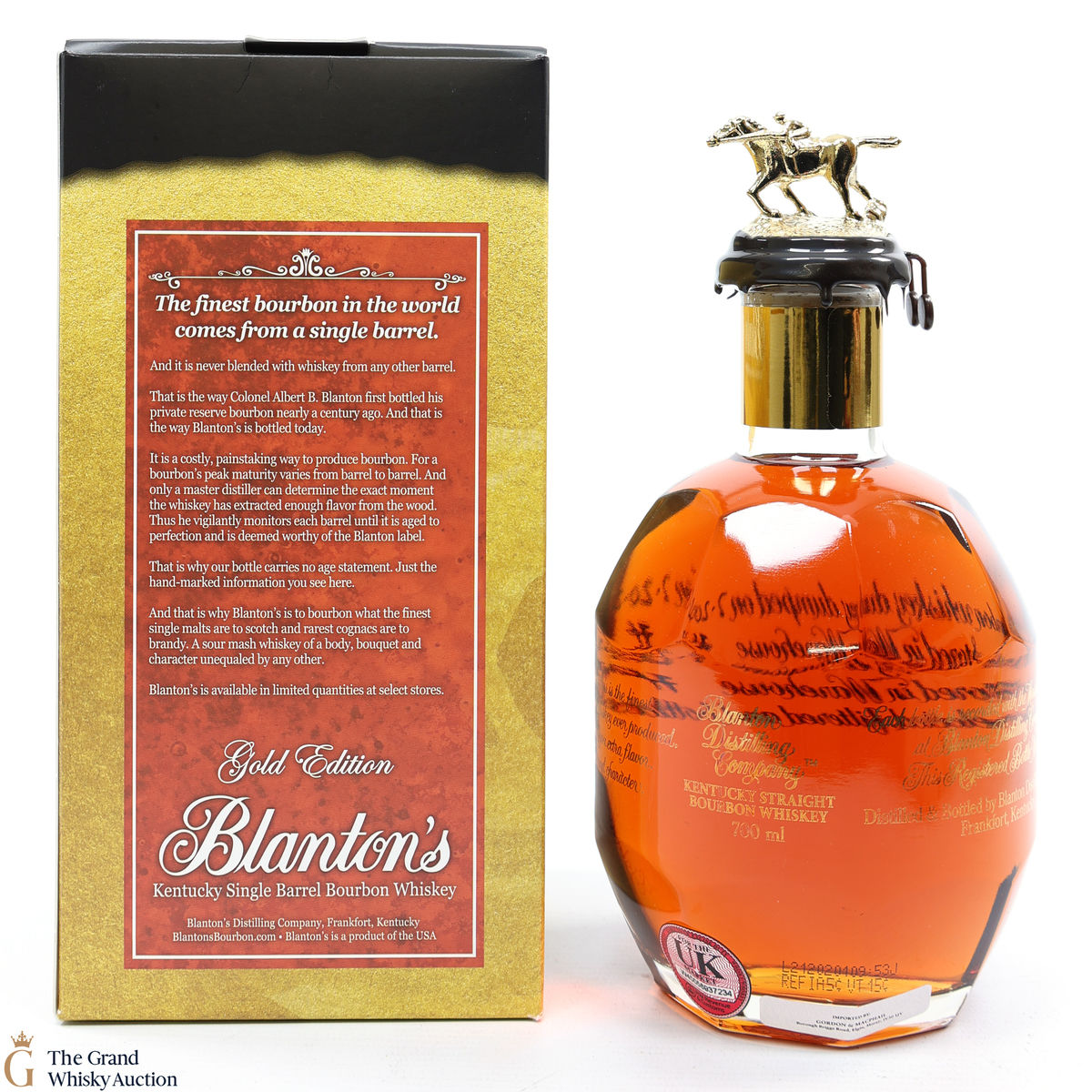 PLEASE NOTE: The wax seal on Blanton's bottles are prone to cracking in transit due to their design. Therefore, as stated in our T&C’s, we do not and will not accept liability should the seal be breached, broken, split or leak in transit. Additionally, please know due to the design of the internal cardboard packaging that surrounds the top of the bottles, it too may be torn. By bidding on this lot you have understood this to be true. Insurance is for complete breakage or loss in transit only.