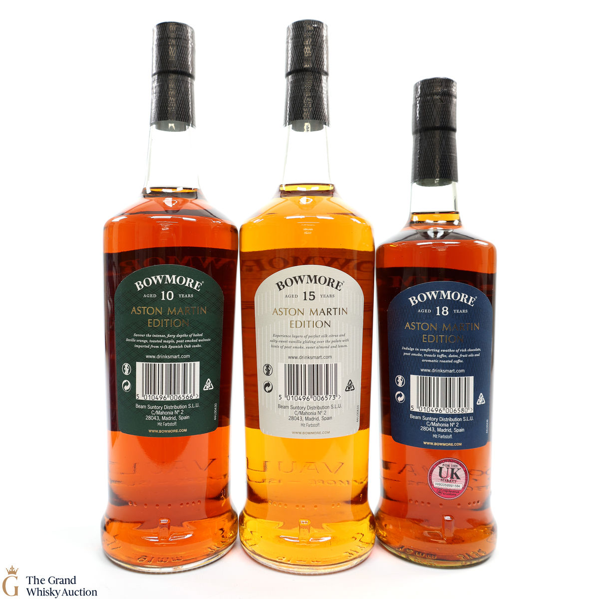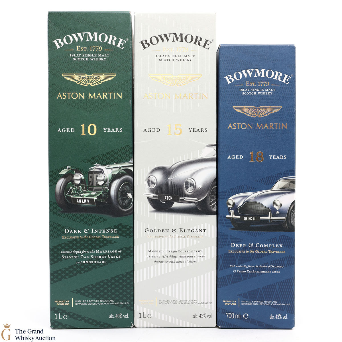 The full collection of the collaboration between Bowmore and Aston Martin, both creating timeless beauty and a lasting legacy. Each edition of the Aston Martin collection features a different car. Included in this lot is edition 1, 2 and 3: