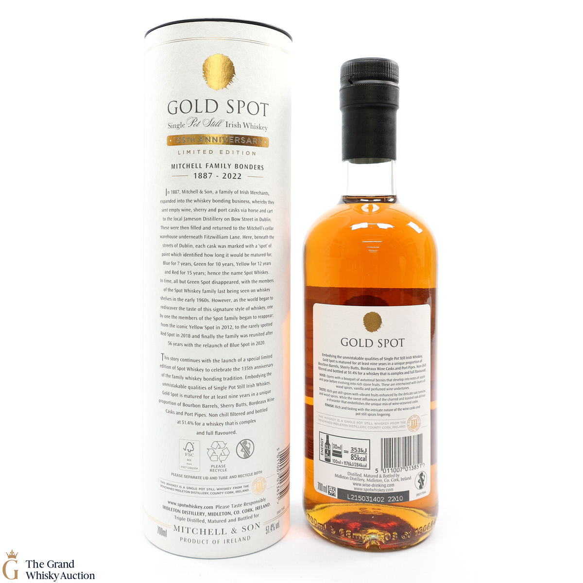 Matured for at least nine years in bourbon barrels, Sherry butts, Bordeaux wine casks, and Port pipes. Gold Spot is non-chill-filtered and bottled at 51.4% ABV.