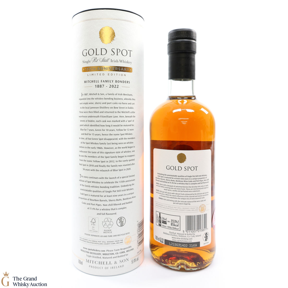 Matured for at least nine years in bourbon barrels, Sherry butts, Bordeaux wine casks, and Port pipes. Gold Spot is non-chill-filtered and bottled at 51.4% ABV.