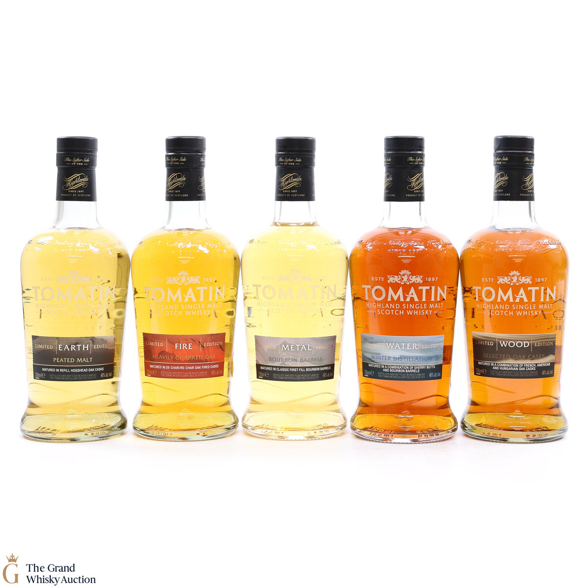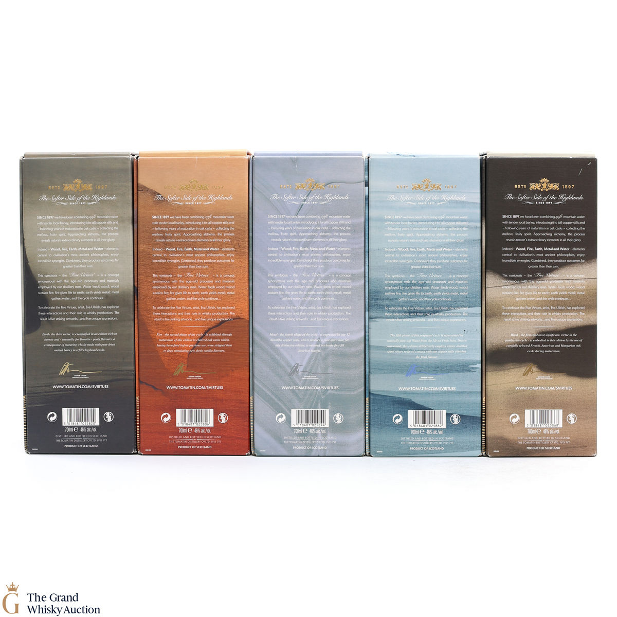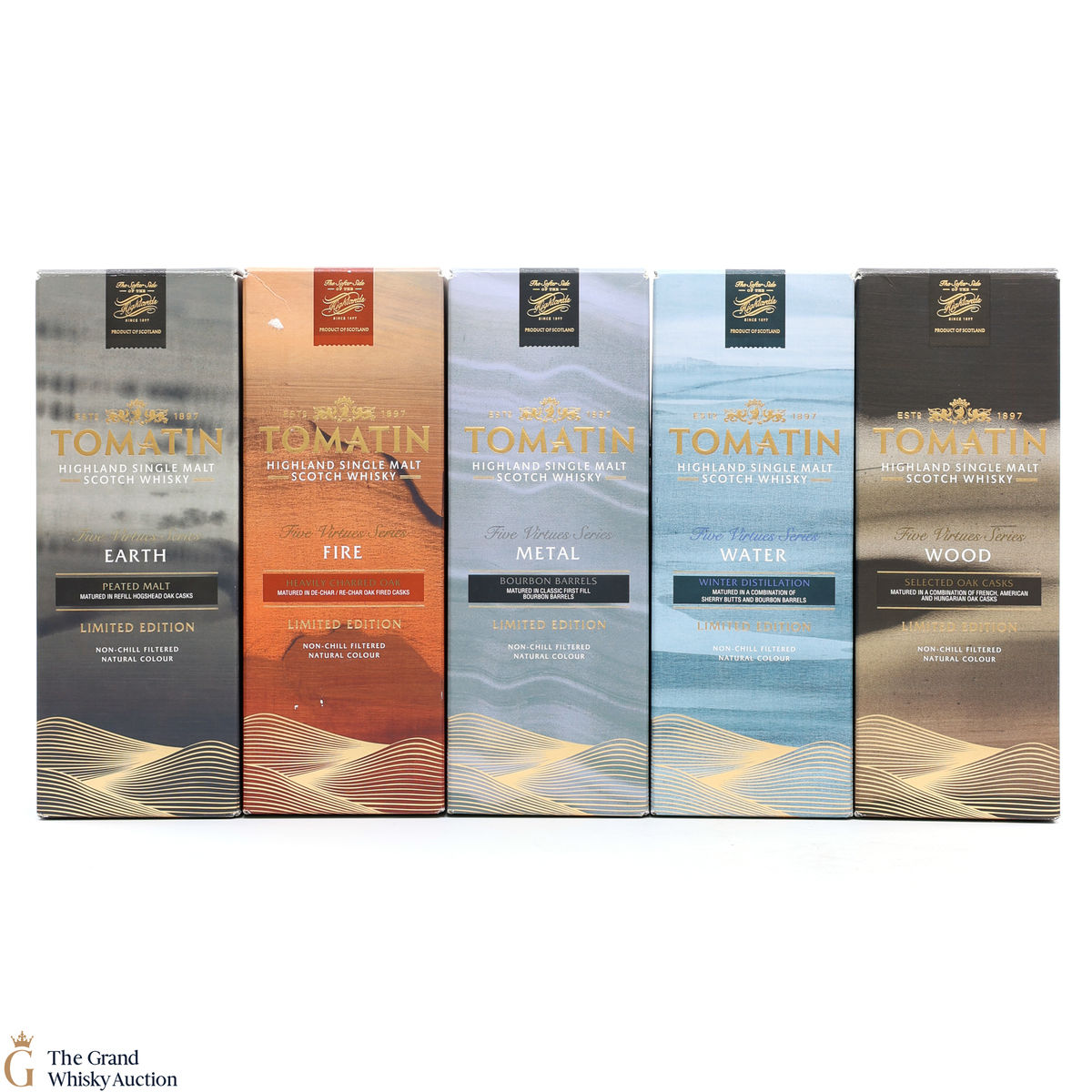 The Tomatin Five Virtues Series was a quintet of whiskies that celebrated the five elements that contribute towards whisky production; Wood, Fire, Earth, Metal and Water. With only 6,000 bottles of each expression produced, the collection featured artwork by Eva Ullrich and was launched in 2017.
