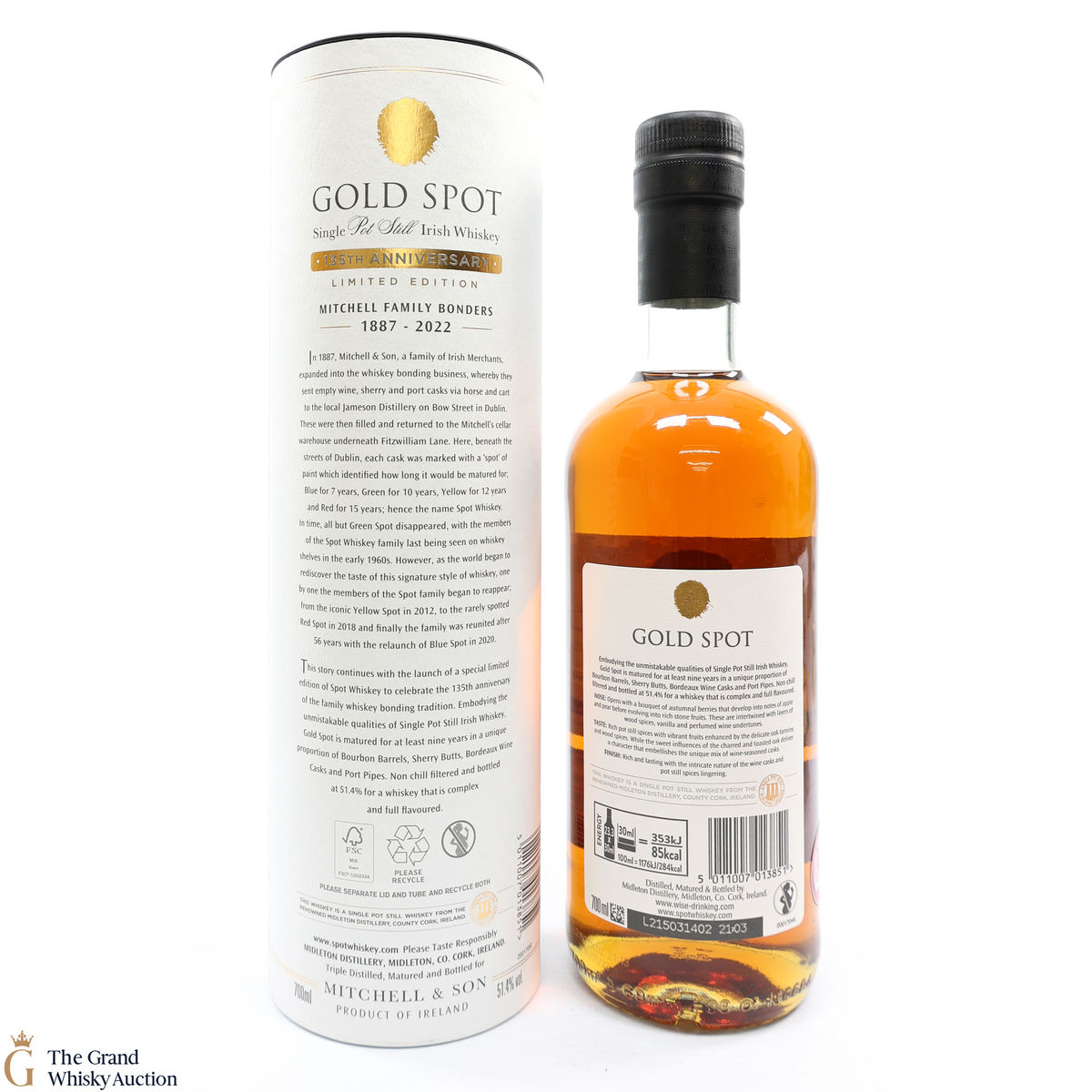 Matured for at least nine years in bourbon barrels, Sherry butts, Bordeaux wine casks, and Port pipes. Gold Spot is non-chill-filtered and bottled at 51.4% ABV.