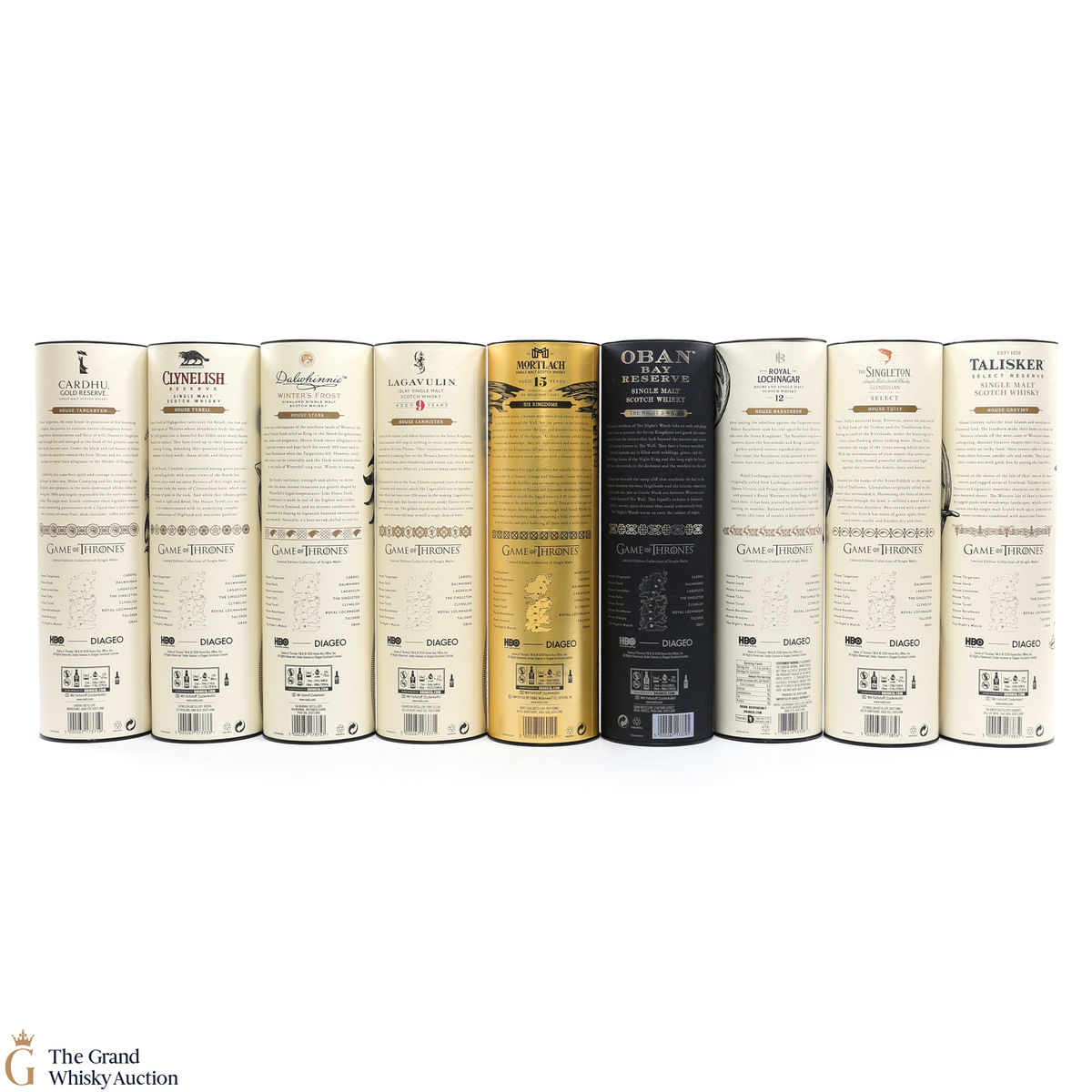 Game of Thrones series plus Johnnie Walker White Walker Game of Thrones edition, Song of Fire and Mortlach, Six Kingdoms edition. This lot includes 10 x 70cl.