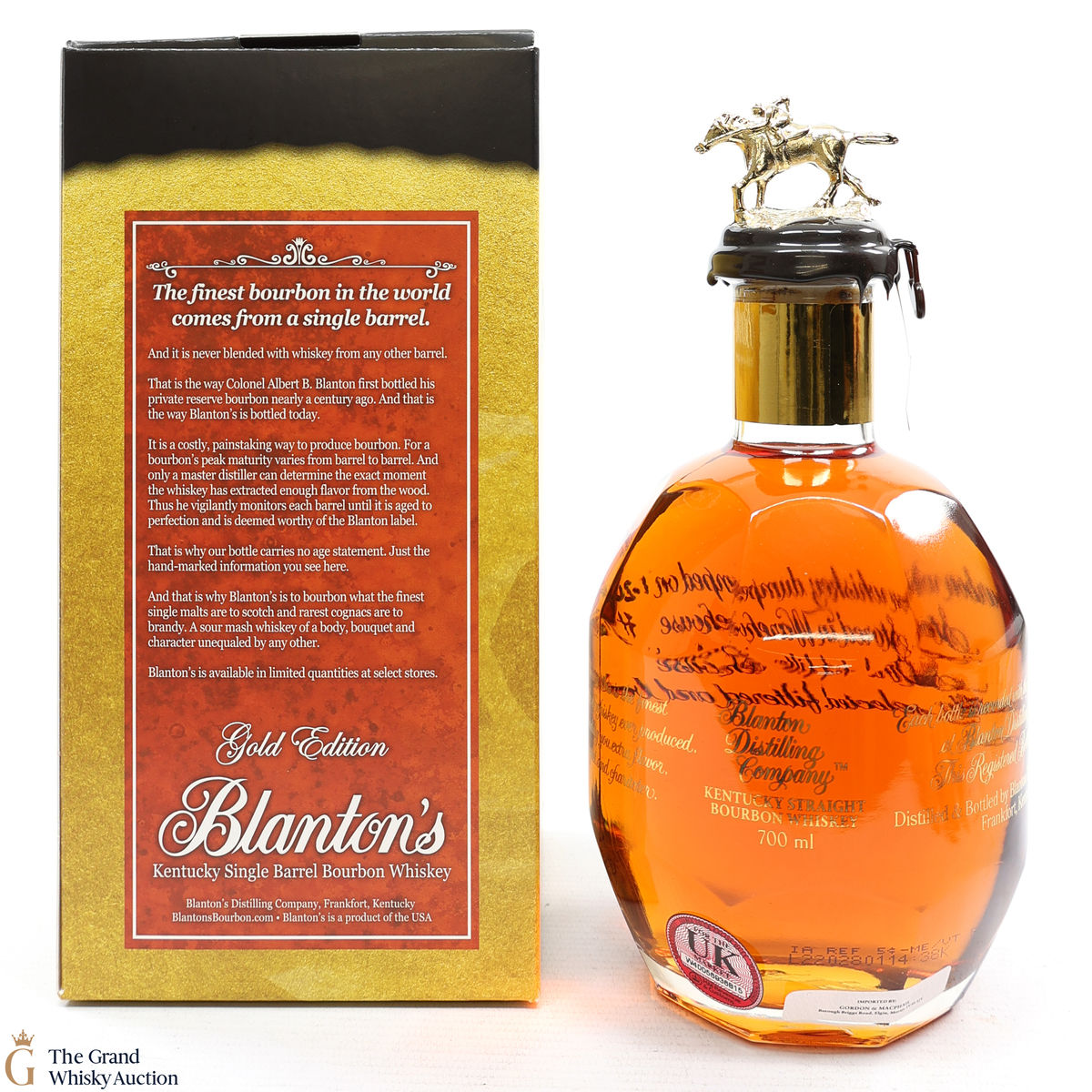 PLEASE NOTE: The wax seal on Blanton's bottles are prone to cracking in transit due to their design. Therefore, as stated in our T&C’s, we do not and will not accept liability should the seal be breached, broken, split or leak in transit. Additionally, please know due to the design of the internal cardboard packaging that surrounds the top of the bottles, it too may be torn. By bidding on this lot you have understood this to be true. Insurance is for complete breakage or loss in transit only.