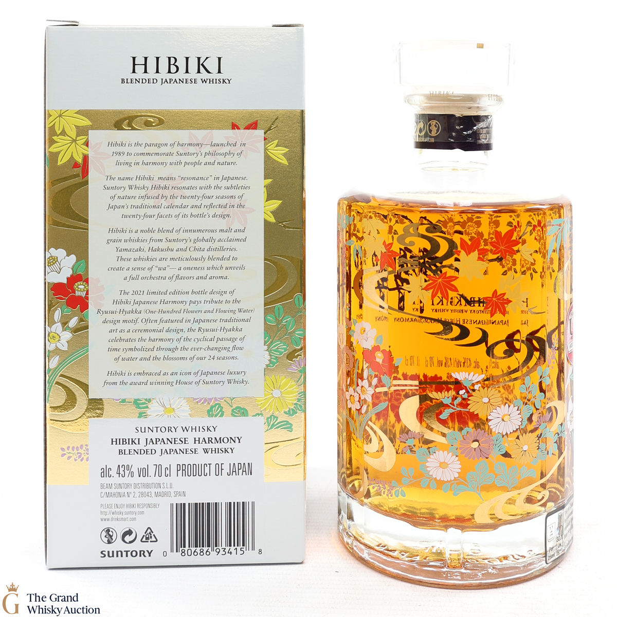This is a limited edition, specially designed bottle with painted flowers and flowing ribbons of water. The 2021 special edition pays homage to the Ryisui-Hyakka (One Hundred Flowers and Flowing Water) and celebrates different seasonal flowers which help characterise the Japanese seasons. 5 types of casks were used and in typical Hibiki fashion, the bottle always has 24 facets which represent 24 seasons in the Japanese lunar calendar.