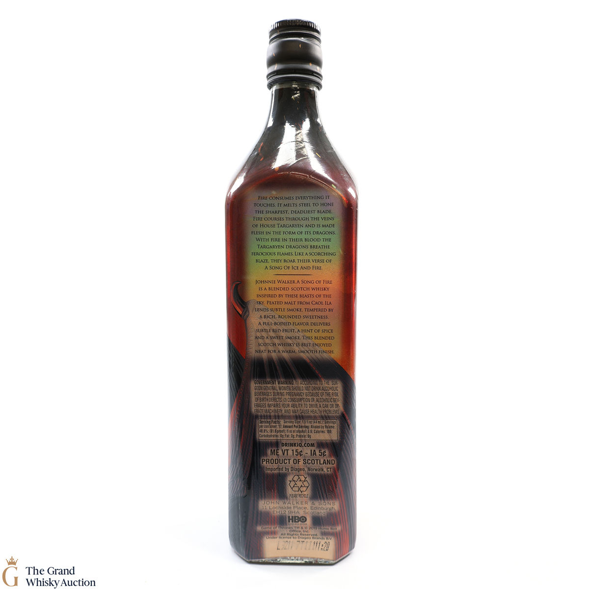 A limited-edition celebration and ode to Game of Thrones, Johnnie Walker A Song of Fire. The subtle notes of the smoke and peated malts from the Caol Ila distillery within the blend pay homage to the Dragons of House Targaryen.