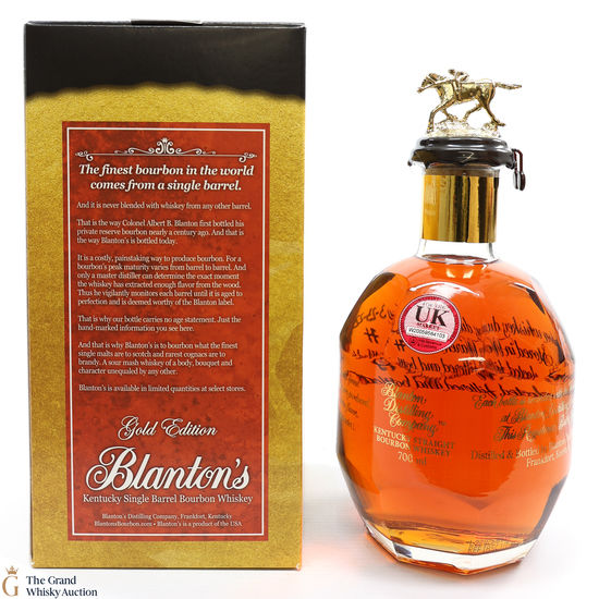PLEASE NOTE: The wax seal on Blanton's bottles are prone to cracking in transit due to their design. Therefore, as stated in our T&C’s, we do not and will not accept liability should the seal be breached, broken, split or leak in transit. Additionally, please know due to the design of the internal cardboard packaging that surrounds the top of the bottles, it too may be torn. By bidding on this lot you have understood this to be true. Insurance is for complete breakage or loss in transit only.