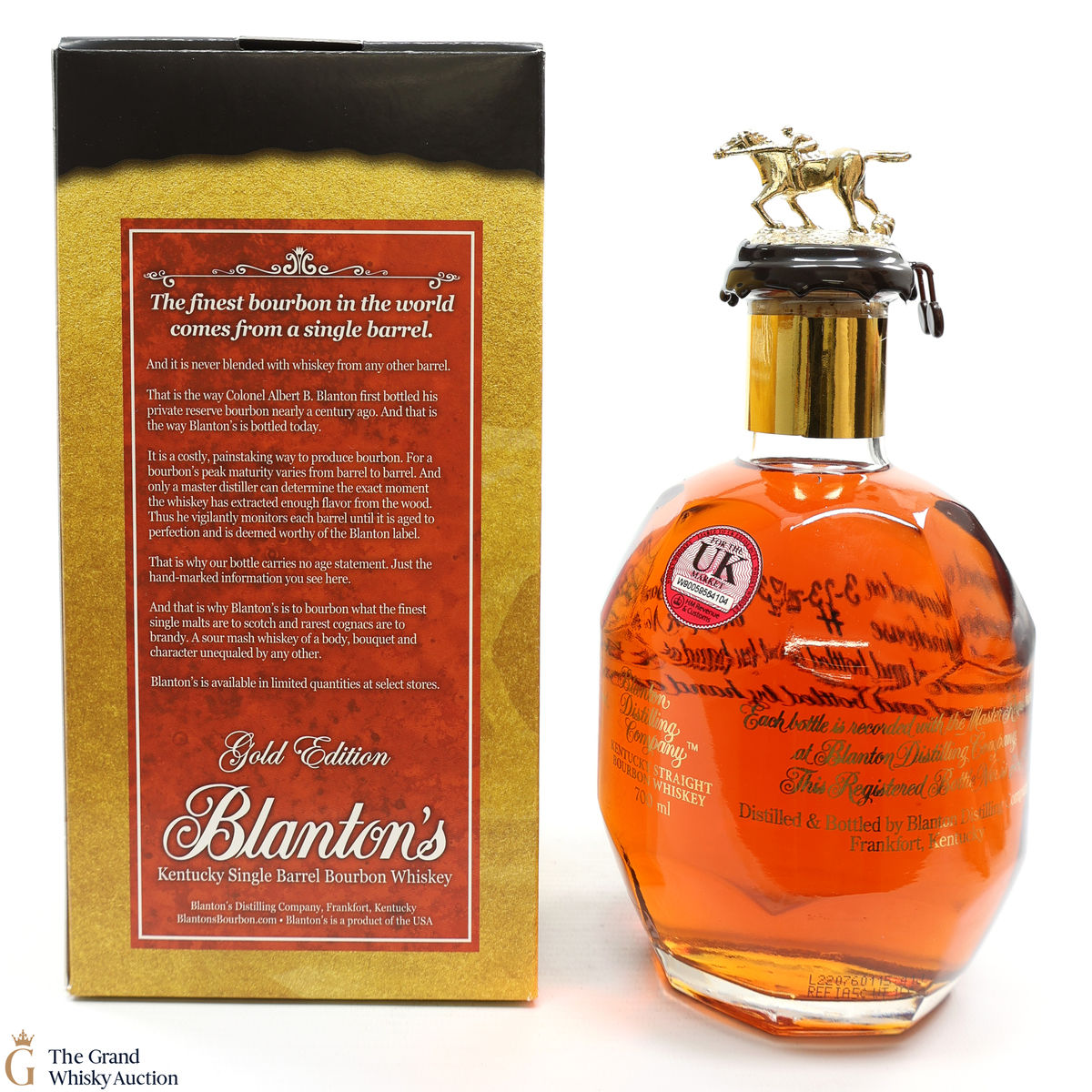 PLEASE NOTE: The wax seal on Blanton's bottles are prone to cracking in transit due to their design. Therefore, as stated in our T&C’s, we do not and will not accept liability should the seal be breached, broken, split or leak in transit. Additionally, please know due to the design of the internal cardboard packaging that surrounds the top of the bottles, it too may be torn. By bidding on this lot you have understood this to be true. Insurance is for complete breakage or loss in transit only.