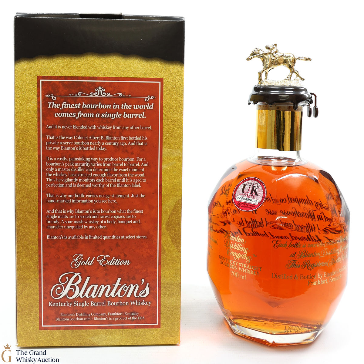PLEASE NOTE: The wax seal on Blanton's bottles are prone to cracking in transit due to their design. Therefore, as stated in our T&C’s, we do not and will not accept liability should the seal be breached, broken, split or leak in transit. Additionally, please know due to the design of the internal cardboard packaging that surrounds the top of the bottles, it too may be torn. By bidding on this lot you have understood this to be true. Insurance is for complete breakage or loss in transit only.
