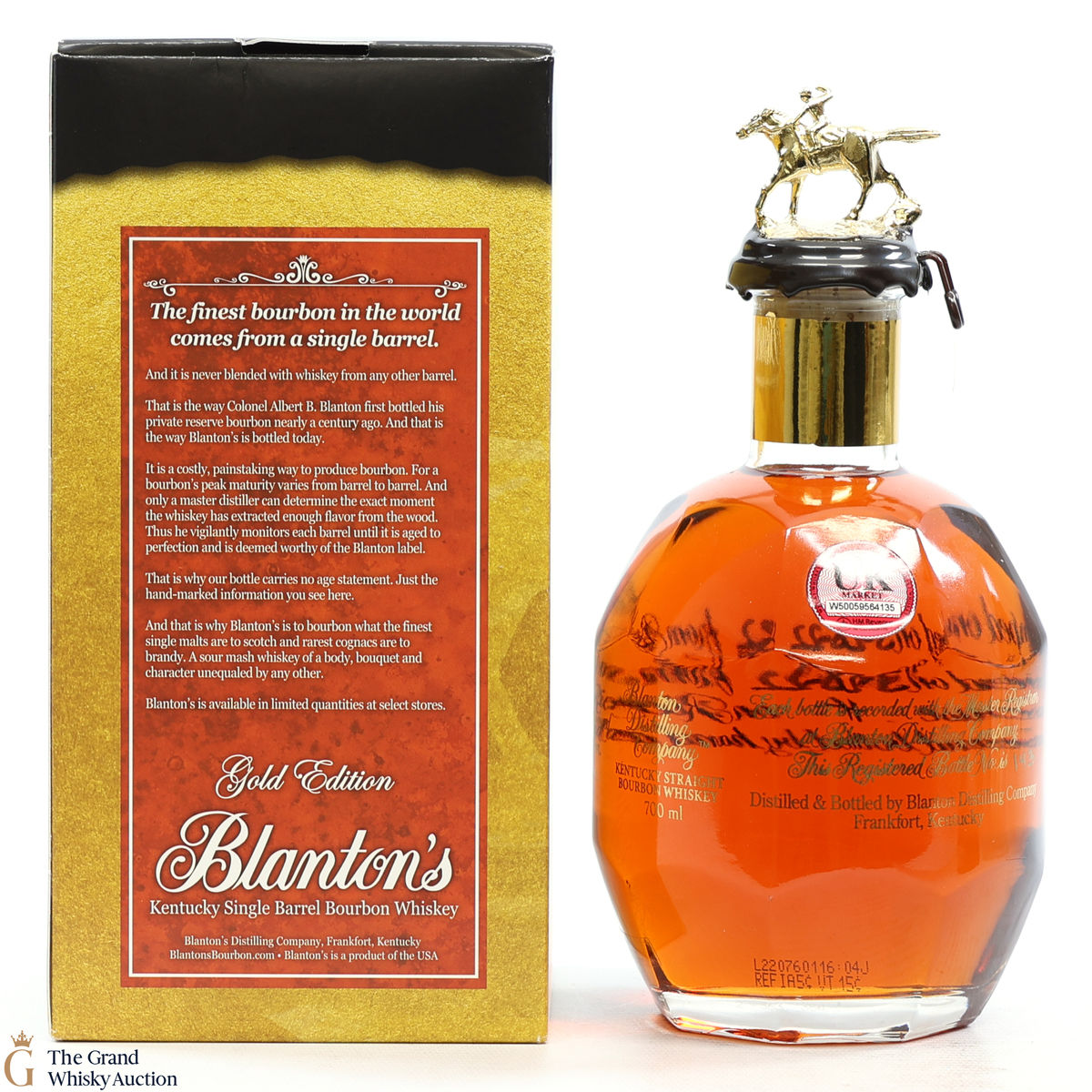 PLEASE NOTE: The wax seal on Blanton's bottles are prone to cracking in transit due to their design. Therefore, as stated in our T&C’s, we do not and will not accept liability should the seal be breached, broken, split or leak in transit. Additionally, please know due to the design of the internal cardboard packaging that surrounds the top of the bottles, it too may be torn. By bidding on this lot you have understood this to be true. Insurance is for complete breakage or loss in transit only.