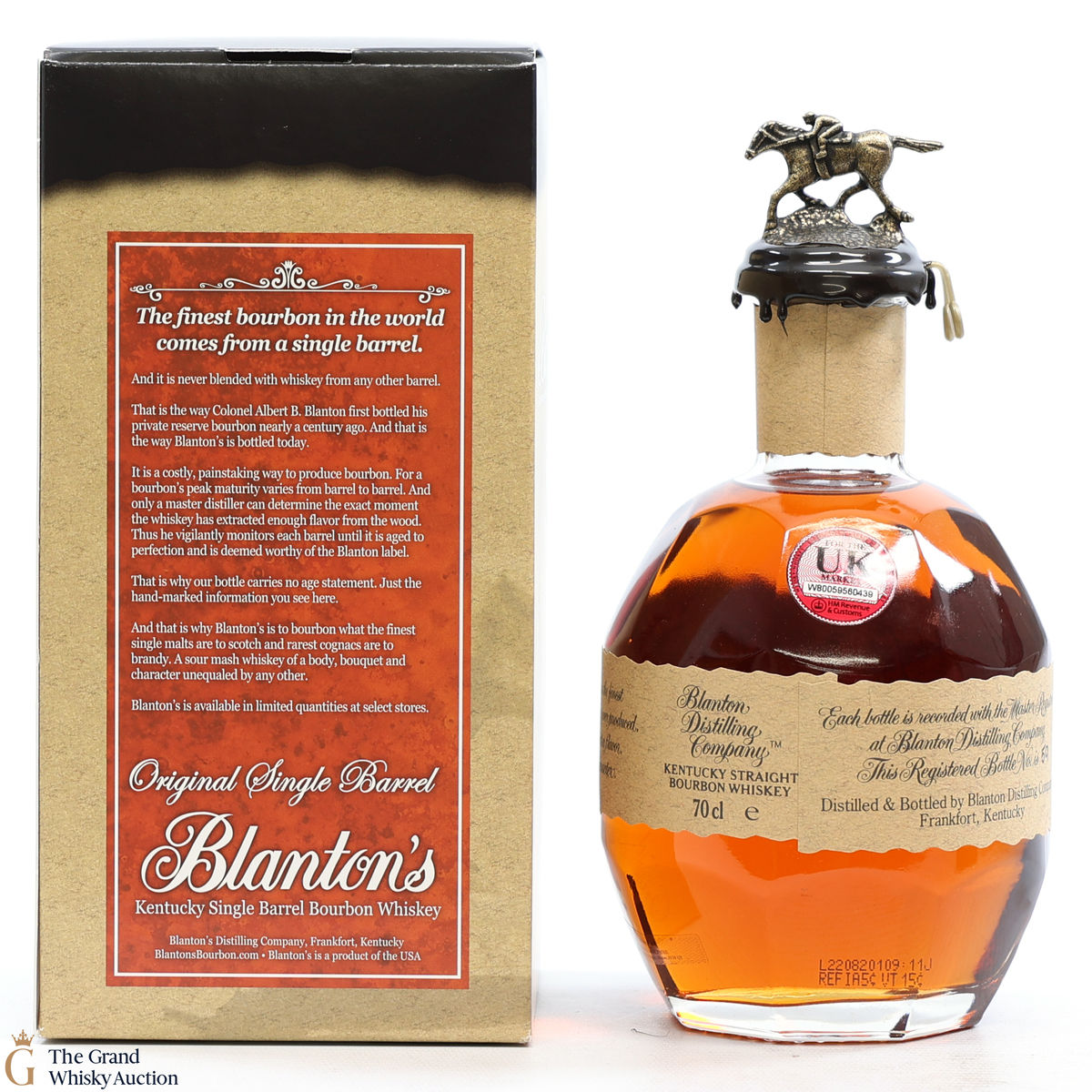 PLEASE NOTE: The wax seal on Blanton's bottles are prone to cracking in transit due to their design. Therefore, as stated in our T&C’s, we do not and will not accept liability should the seal be breached, broken, split or leak in transit. Additionally, please know due to the design of the internal cardboard packaging that surrounds the top of the bottles, it too may be torn. By bidding on this lot you have understood this to be true. Insurance is for complete breakage or loss in transit only.