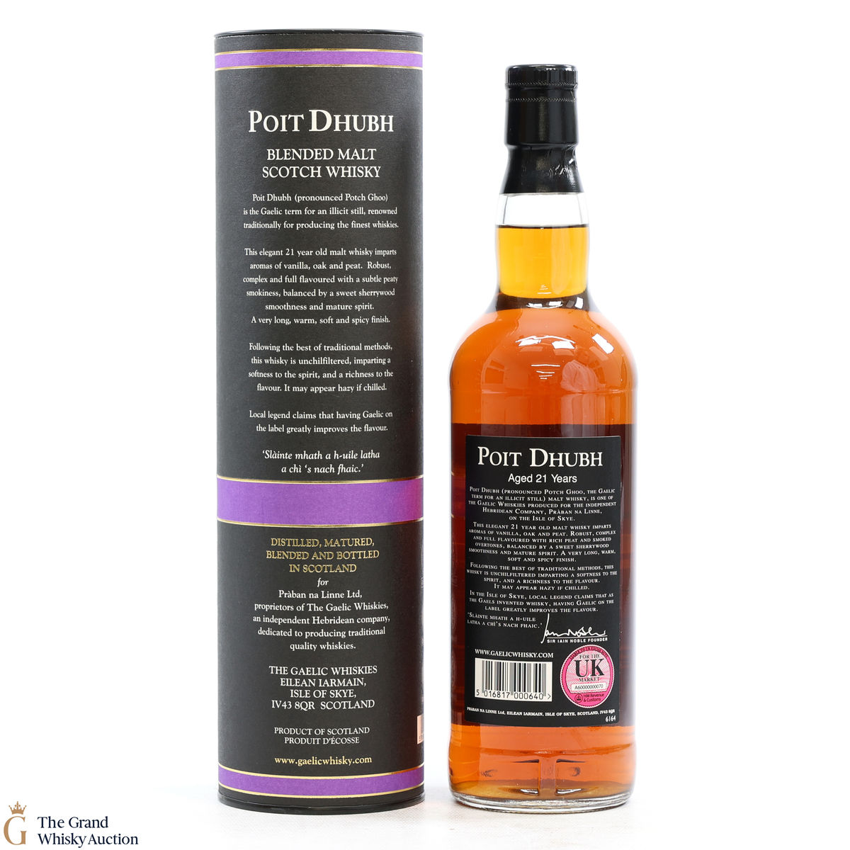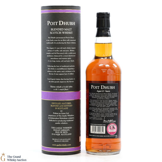 This is an old Gaelic whisky, aged for 21 years. Poit Dubh is Gaelic for Black Pot, a name for an illicit still. This is a blended malt.