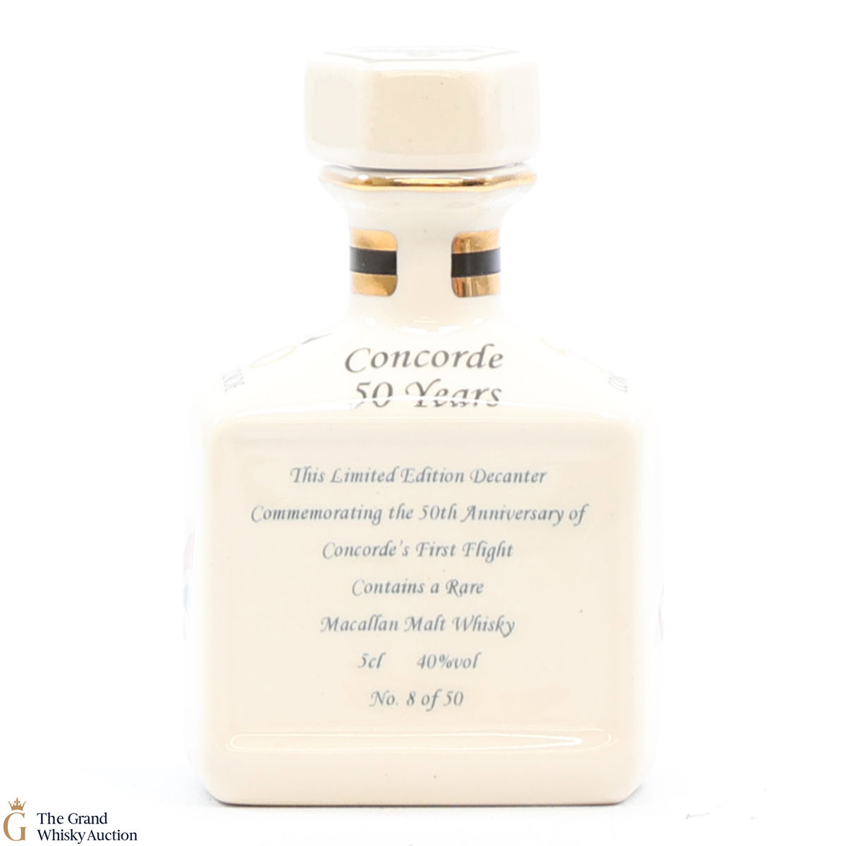 A mini decanter commemorating the 50th anniversary of Concorde's First Flight. Filled with Macallan, this is one of 50 bottles released.