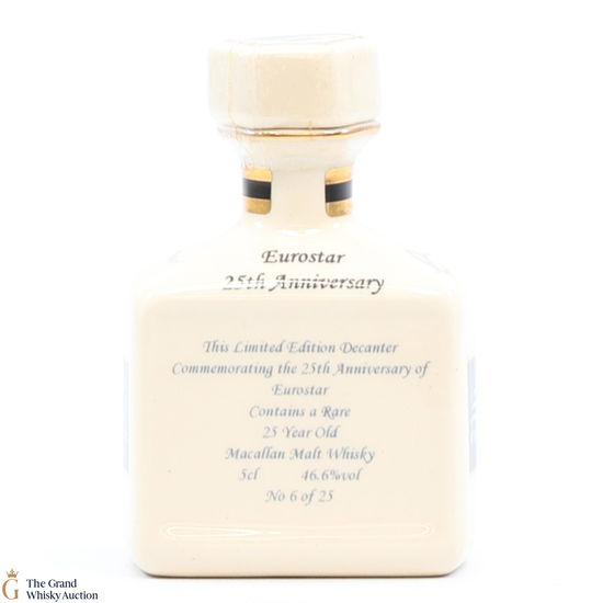 A mini decanter commemorating the 25th anniversary of the Eurostar. Filled with 25 year old Macallan, this is one of 25 bottles released.