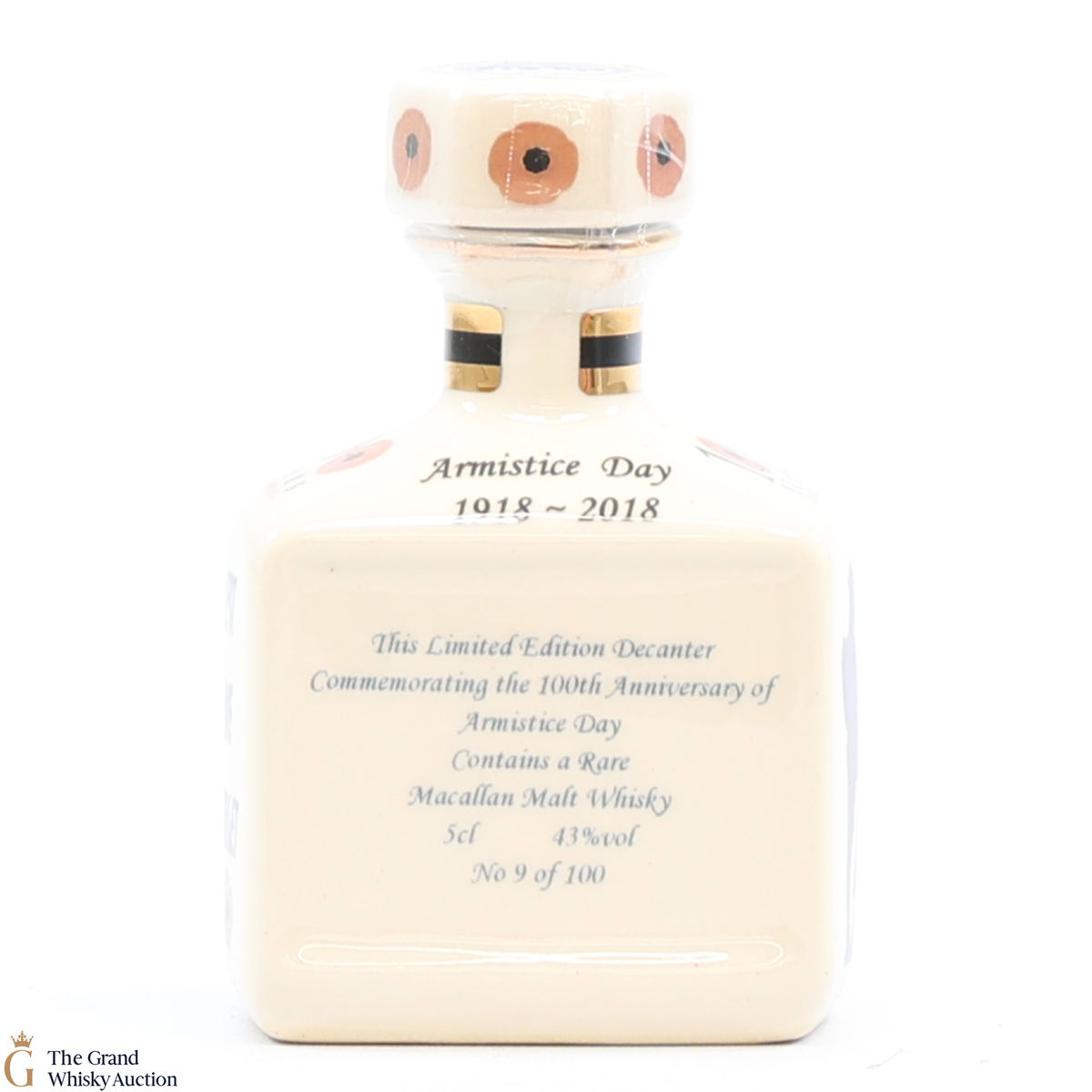 A mini decanter commemorating the 100th anniversary of the Armistice Day 1918-2018. Filled with a rare Macallan Malt Whisky, this is one of 100 bottles released.