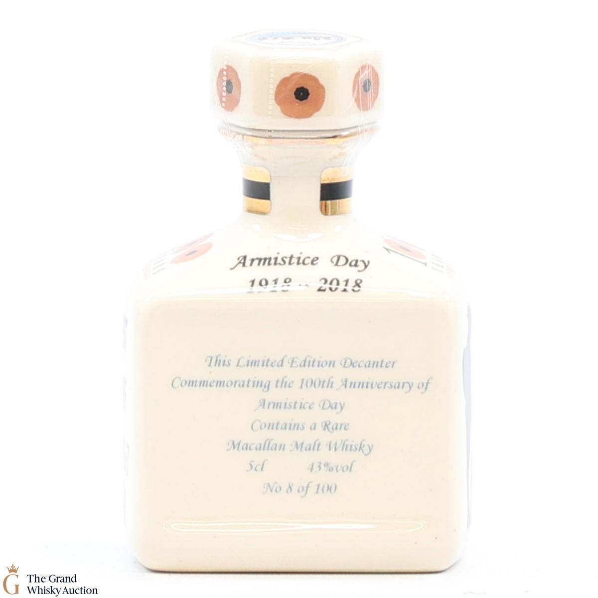 A mini decanter commemorating the 100th anniversary of the Armistice Day 1918-2018. Filled with a rare Macallan Malt Whisky, this is one of 100 bottles released.