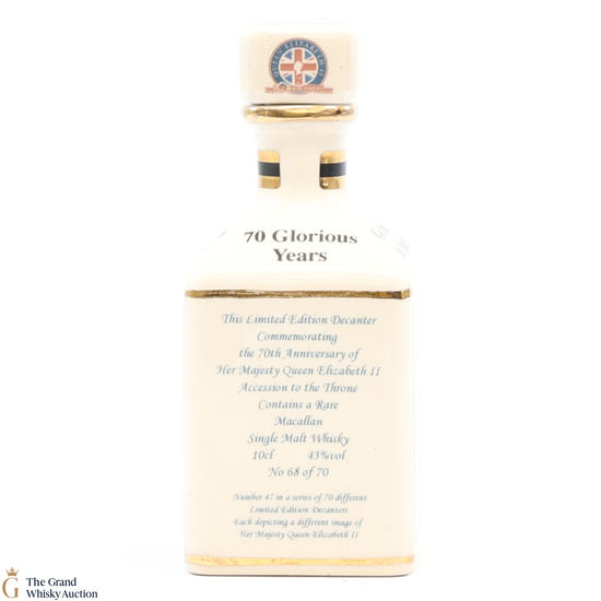 A mini decanter commemorating the 70th Anniversary of Her Majesty Queen Elizabeth II Accession to the Throne. Filled with a rare Macallan, there were only 70 full sets released which consisted of 70 different bottles.