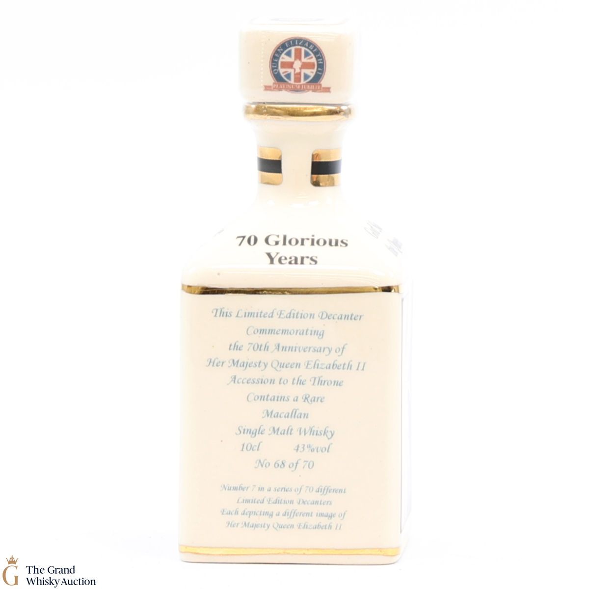 A mini decanter commemorating the 70th Anniversary of Her Majesty Queen Elizabeth II Accession to the Throne. Filled with a rare Macallan, there were only 70 full sets released which consisted of 70 different bottles.