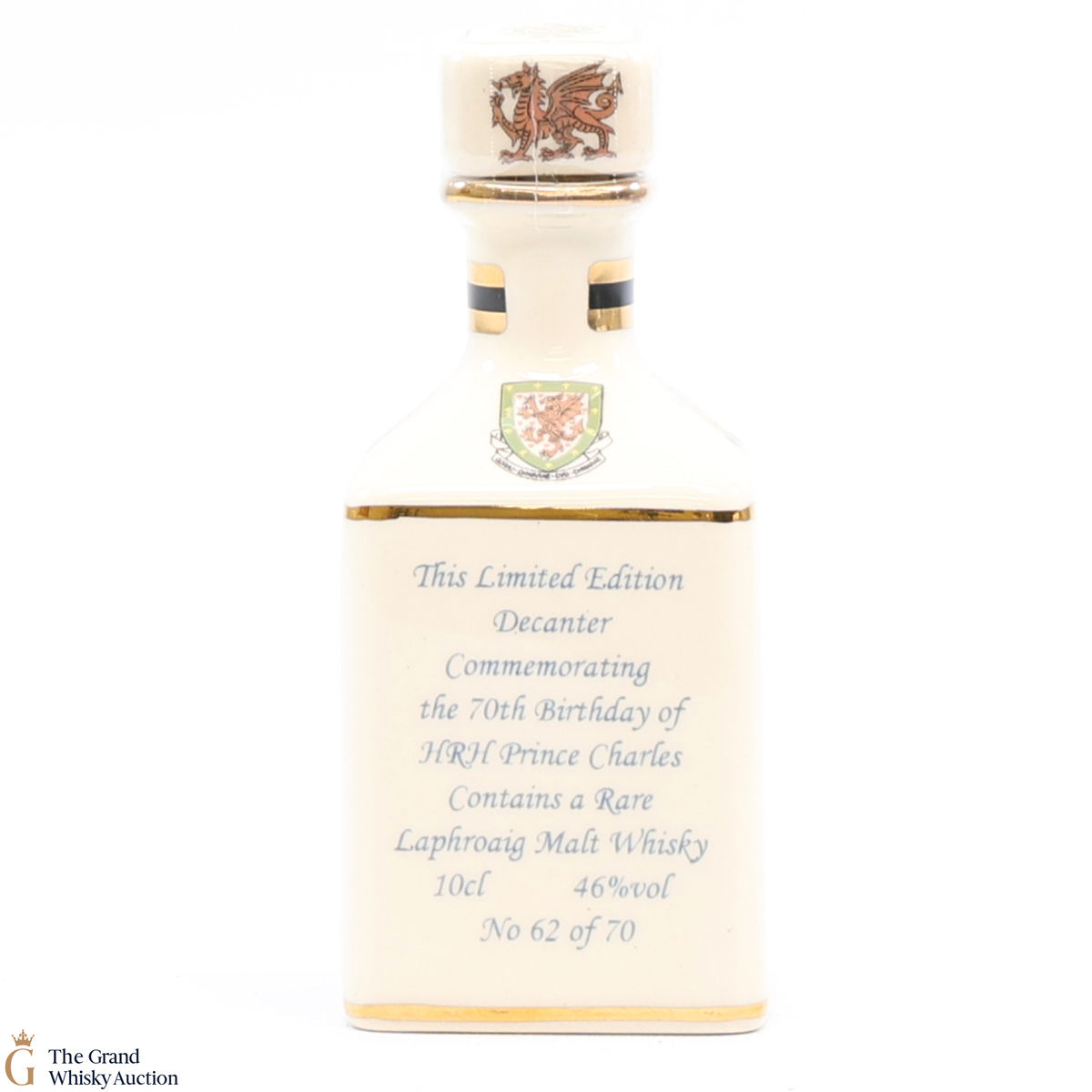 A mini decanter commemorating the 70th birthday of HRH Prince Charles. Filled with Laphroaig, this is one of 70 bottles released.
