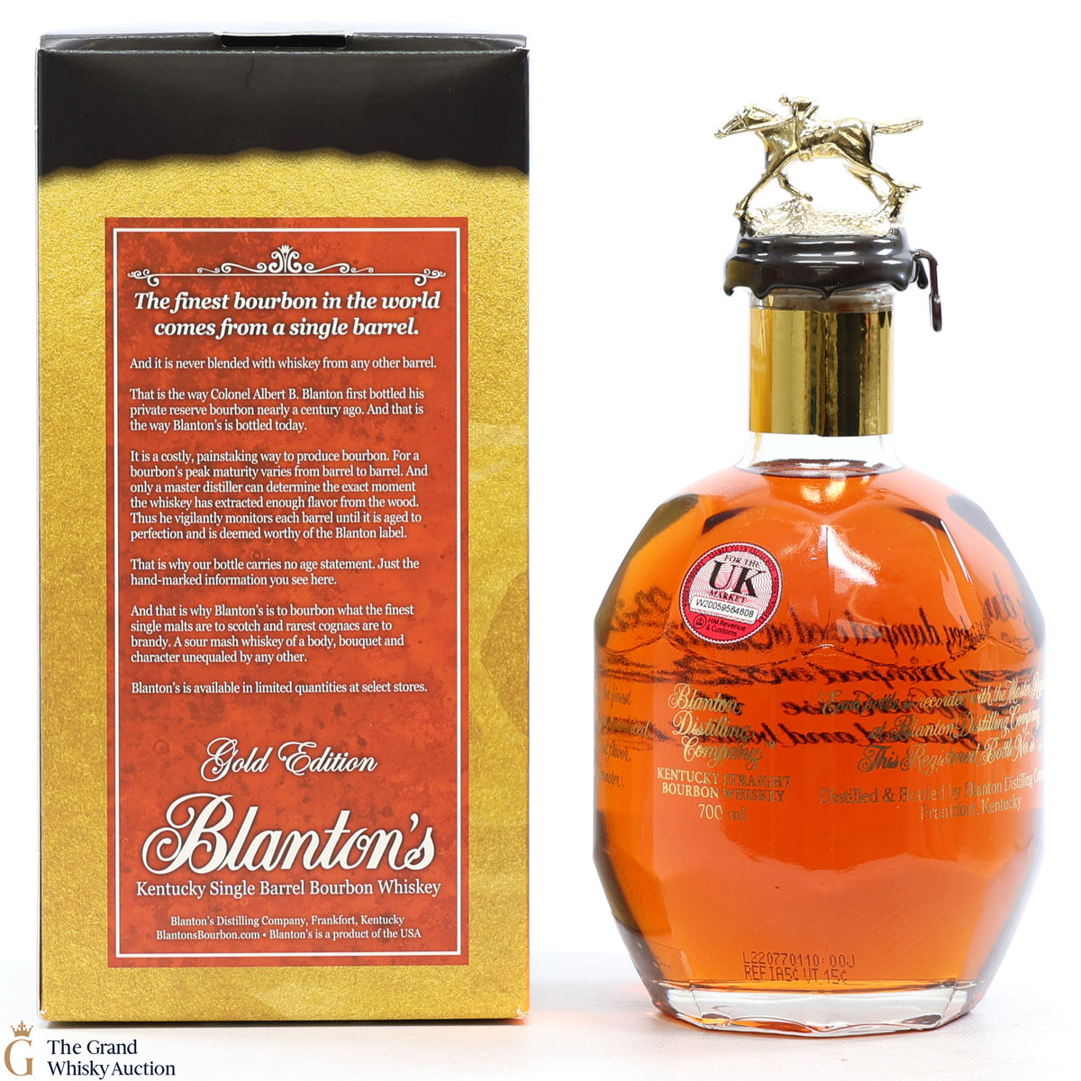 PLEASE NOTE: The wax seal on Blanton's bottles are prone to cracking in transit due to their design. Therefore, as stated in our T&C’s, we do not and will not accept liability should the seal be breached, broken, split or leak in transit. Additionally, please know due to the design of the internal cardboard packaging that surrounds the top of the bottles, it too may be torn. By bidding on this lot you have understood this to be true. Insurance is for complete breakage or loss in transit only.