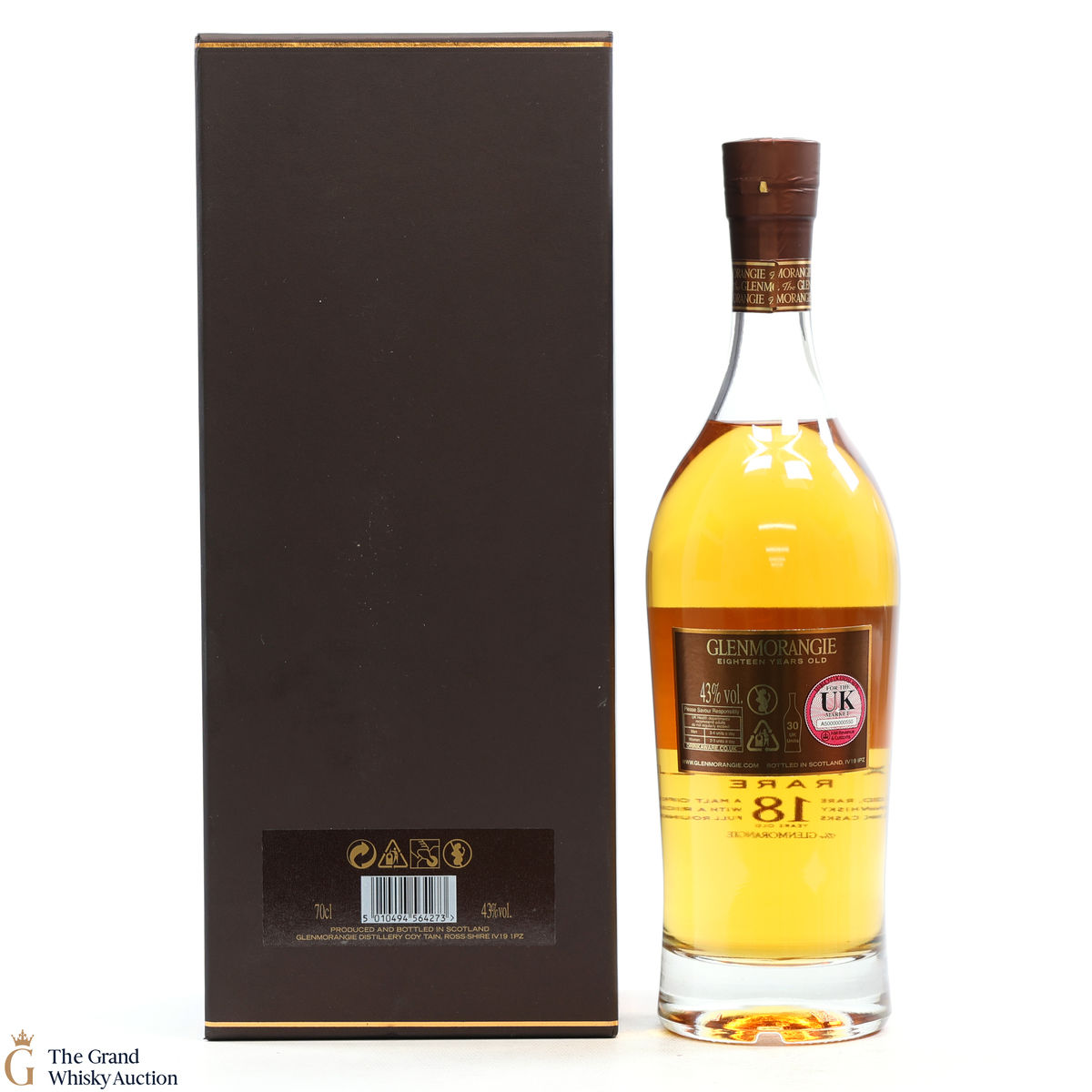 This bottle is an 18-year-old Extremely Rare, Highland single malt produced by Glenmorangie. It has been perfected by the sixteen men of Tain who have specially aged this bottle for 18 years in superior oak casks.