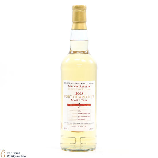 A 2008 Port Charlotte, bottled at 3 years old in 2012 from single cask #3243. A limited run of only 200 bottles.
