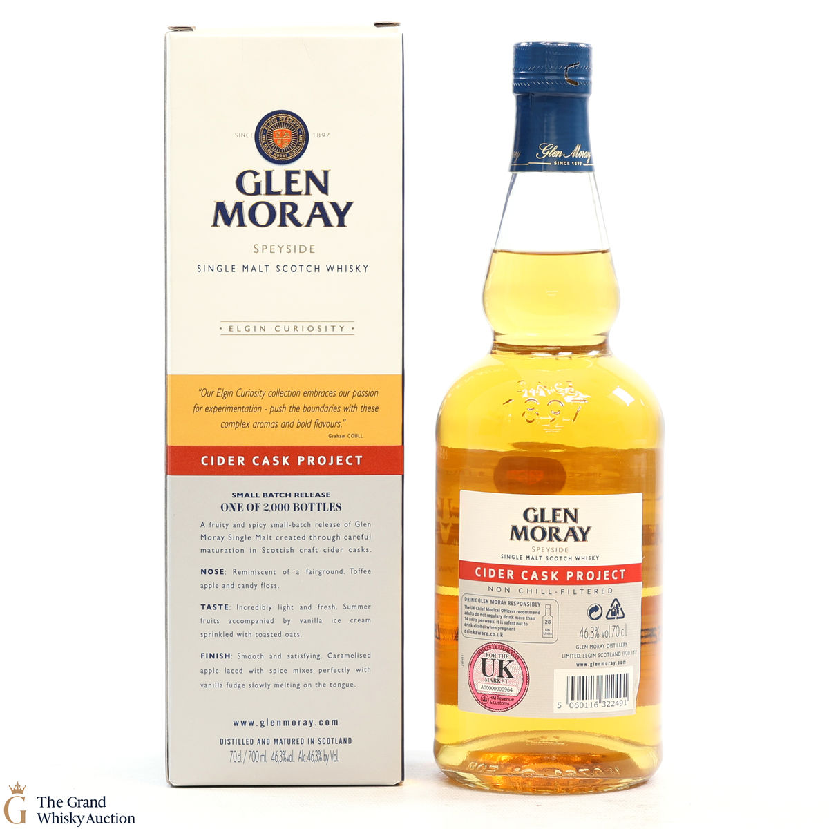 This is a UK exclusive experimental release from Glen Moray. This whisky has been finished in ones that were previously used to hold Thistly Cross Scottish craft cider. This is a small batch bottling and this is one of just 2000 bottles produced.