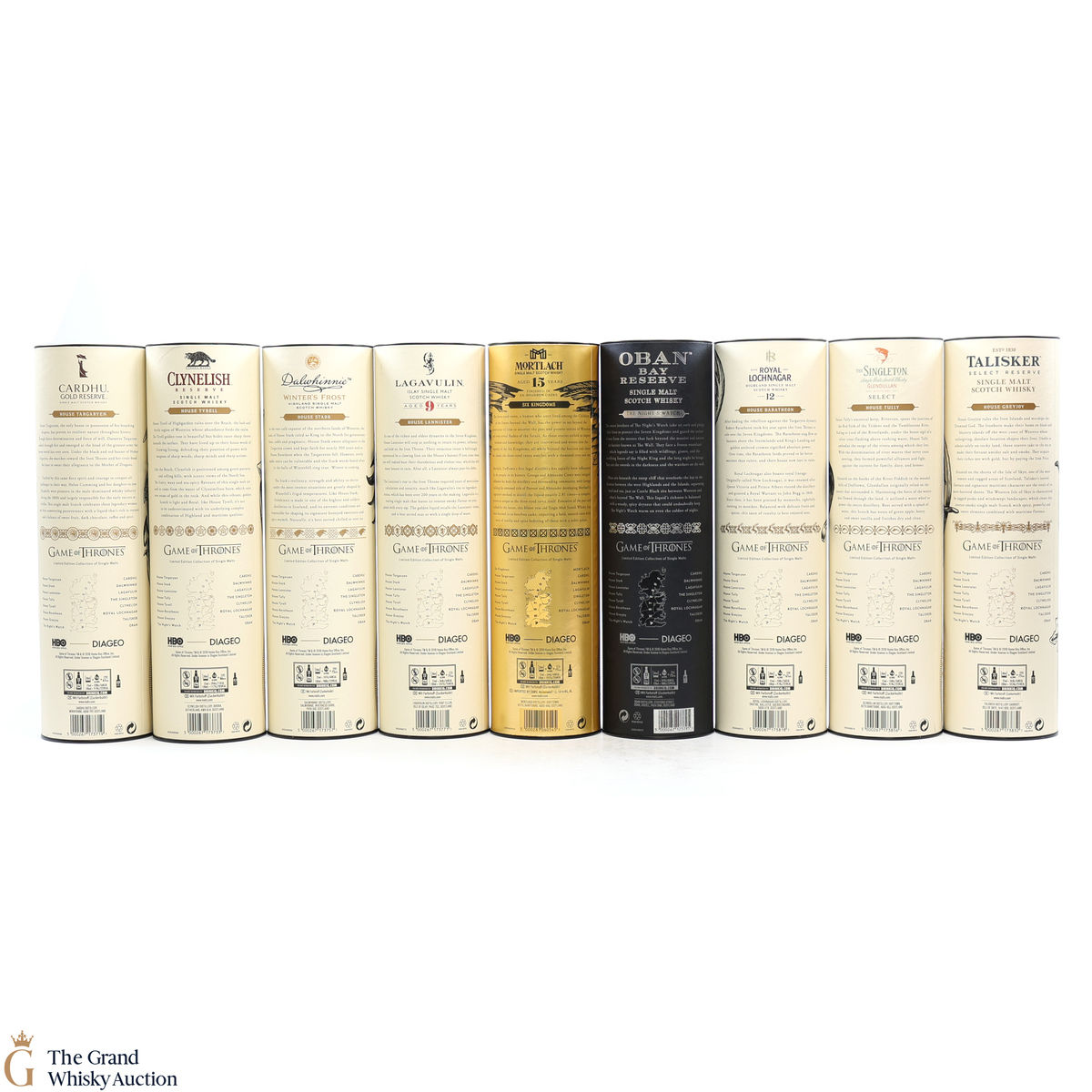 Game of Thrones series plus Johnnie Walker White Walker Game of Thrones edition, Song of Fire and Mortlach, Six Kingdoms edition. This lot includes 12 x 70cl.