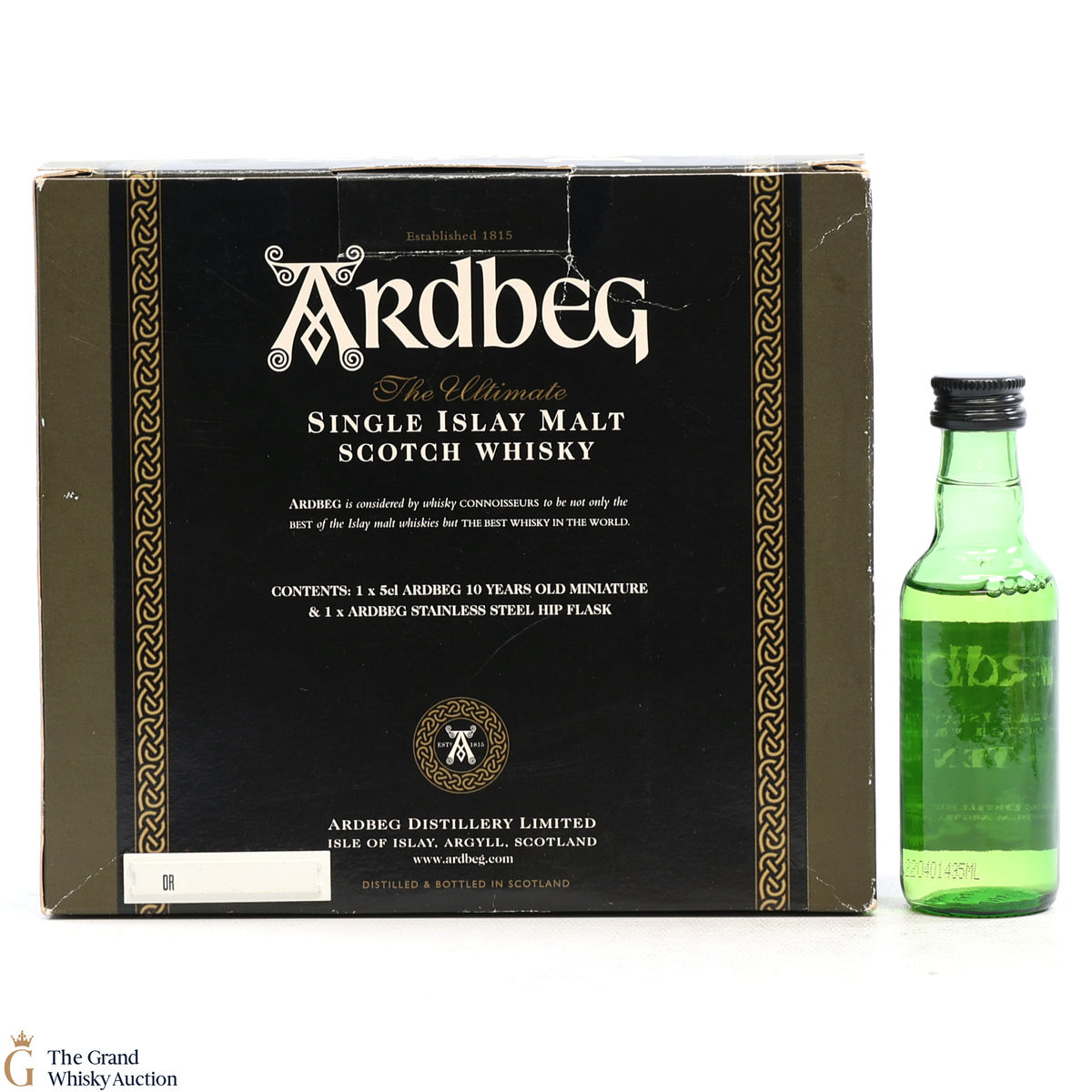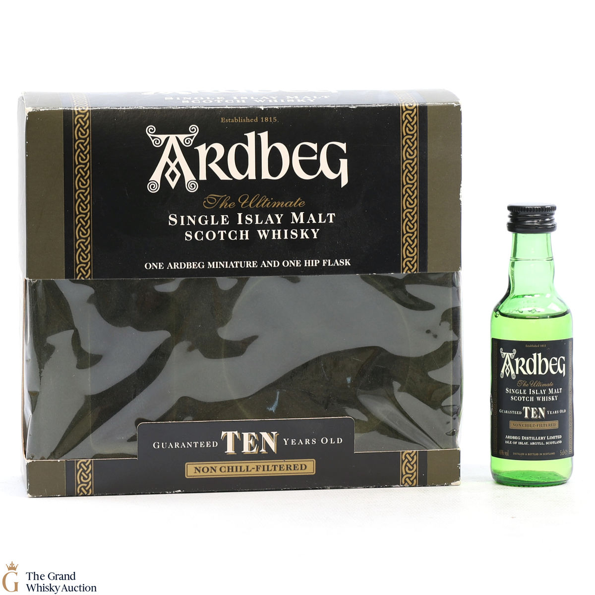 This gift set includes a 5cl bottling of Ardbeg 10 Year Old and Ardbeg Hip Flask.