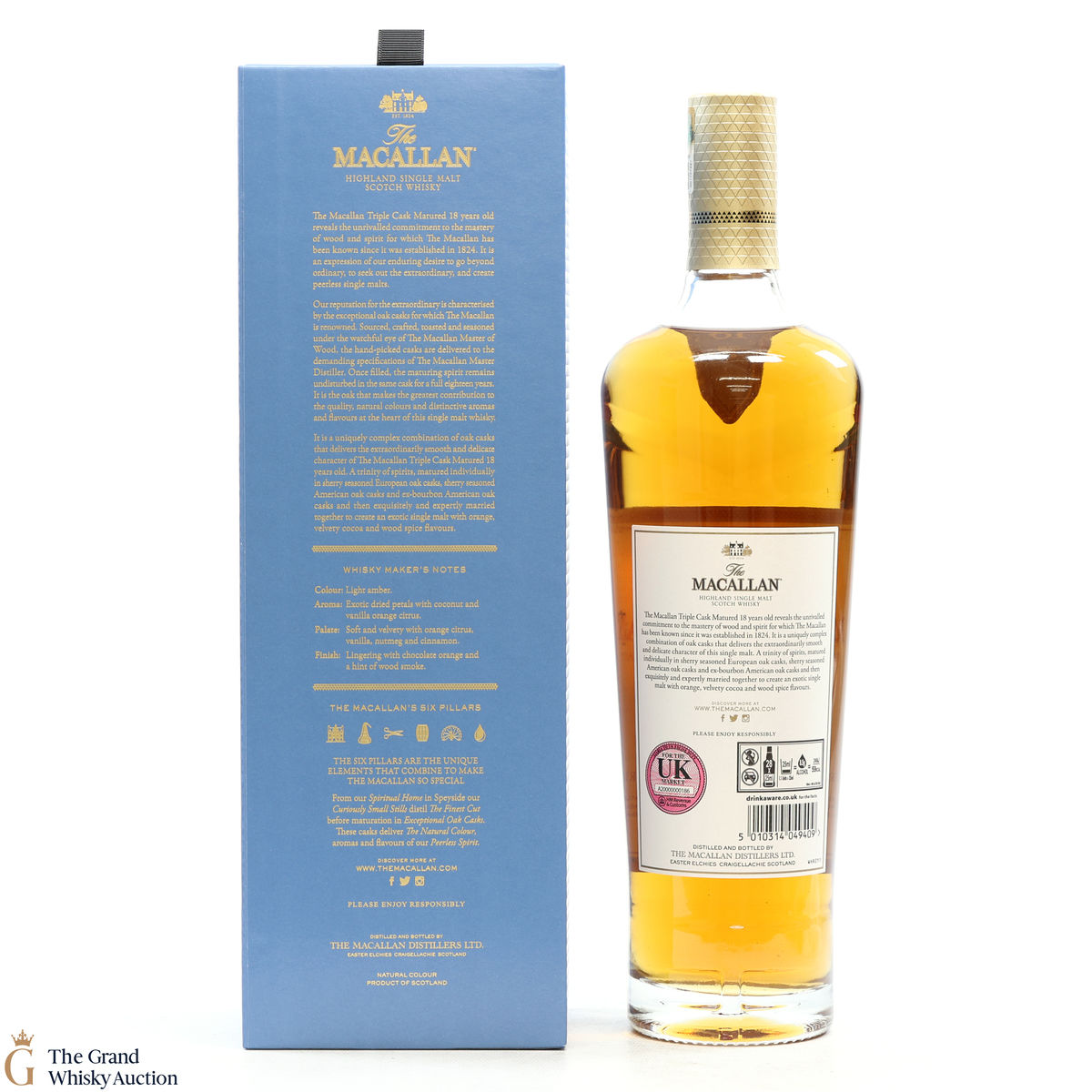 This 18 year old Macallan single malt was released in 2018 and sits is at the top of the Triple Cask range (which replaced the Fine Oak range). The whisky was matured in a combination of European sherry seasoned casks, American sherry seasoned casks and American ex-bourbon casks. This expression boasts bountiful notes of vanilla, dried fruit and woody spice.