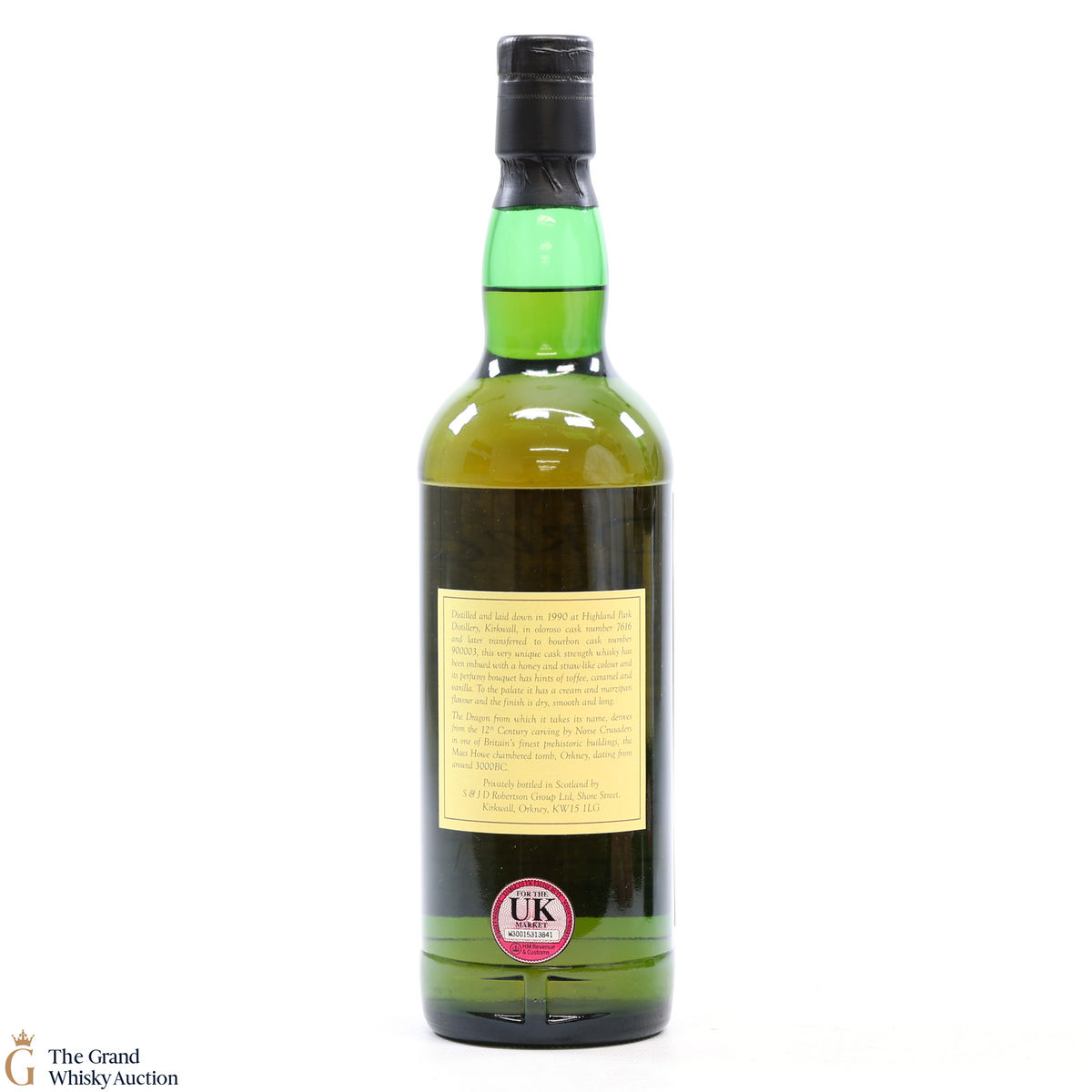 This 19 year old single malt is from Orkney's Highland Park Distillery, distilled back in 1990. It was matured in Oloroso sherry cask #7616 and later transferred to bourbon cask #900003. It was bottled nearly two decades later by S. & J. D. Robertson, at natural cask strength, as part of The Dragon Range. The Dragon Bottlings are legendary and highly sought after by many.