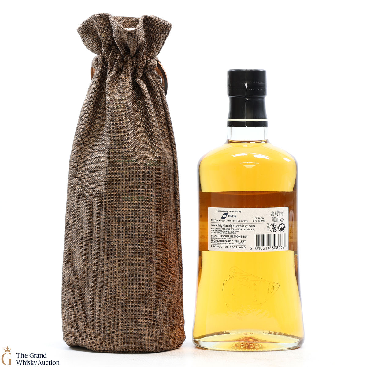 This release is part of Highland Park's Single Cask Series. It was exclusively selected by DFDS Ferries for The King & Princess Seaways. The single malt was distilled in 2004, matured in Refill Butt #5377 for 14 years until 2018 when 243 bottles were produced.