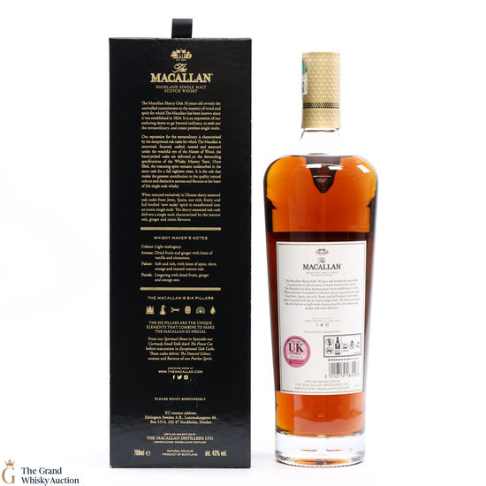 This annual release of The Macallan's popular 18 Year Old Sherry Oak is matured exclusively in sherry seasoned casks, built from both Spanish and American oak, providing a beautifully dark flavour with rich aromas.