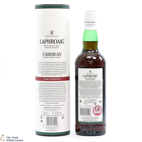 The 2021 edition of Laphroaigs Cairdeas series was first matured in a 1st fill American oak ex-bourbon barrel, then in an American oak ex-bourbon quarter cask before finally being finished in European PX sherry casks. Bottled at the cask strength of 58.9% ABV in 2021 to celebrate the Friends of Laphroaig.