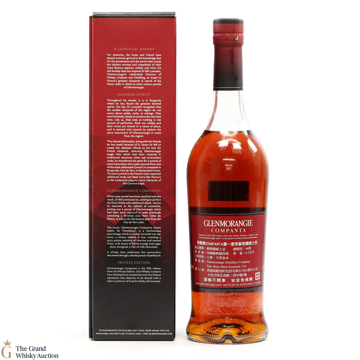 After first maturing in American white oak ex-bourbon barrels, the Companta was matured in 60% Burgundy wine casks from Clos de Tart and 40% Rhône Valley casks that previously held Rasteau, sourced by Glenmorangie's Director of Distilling, Dr. Bill Lumsden.