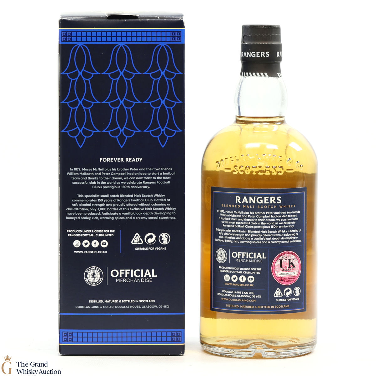 Rangers 150th Anniversary Blended Malt Scotch Whisky. This Limited Edition small batch Blended Malt Scotch Whisky commemorates 150 years of Rangers Football Club. Matured in Oak casks selected by Rangers Football Club. This is one of only 300 bottles.