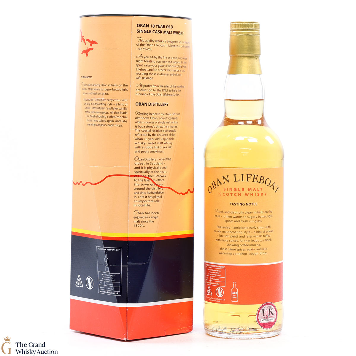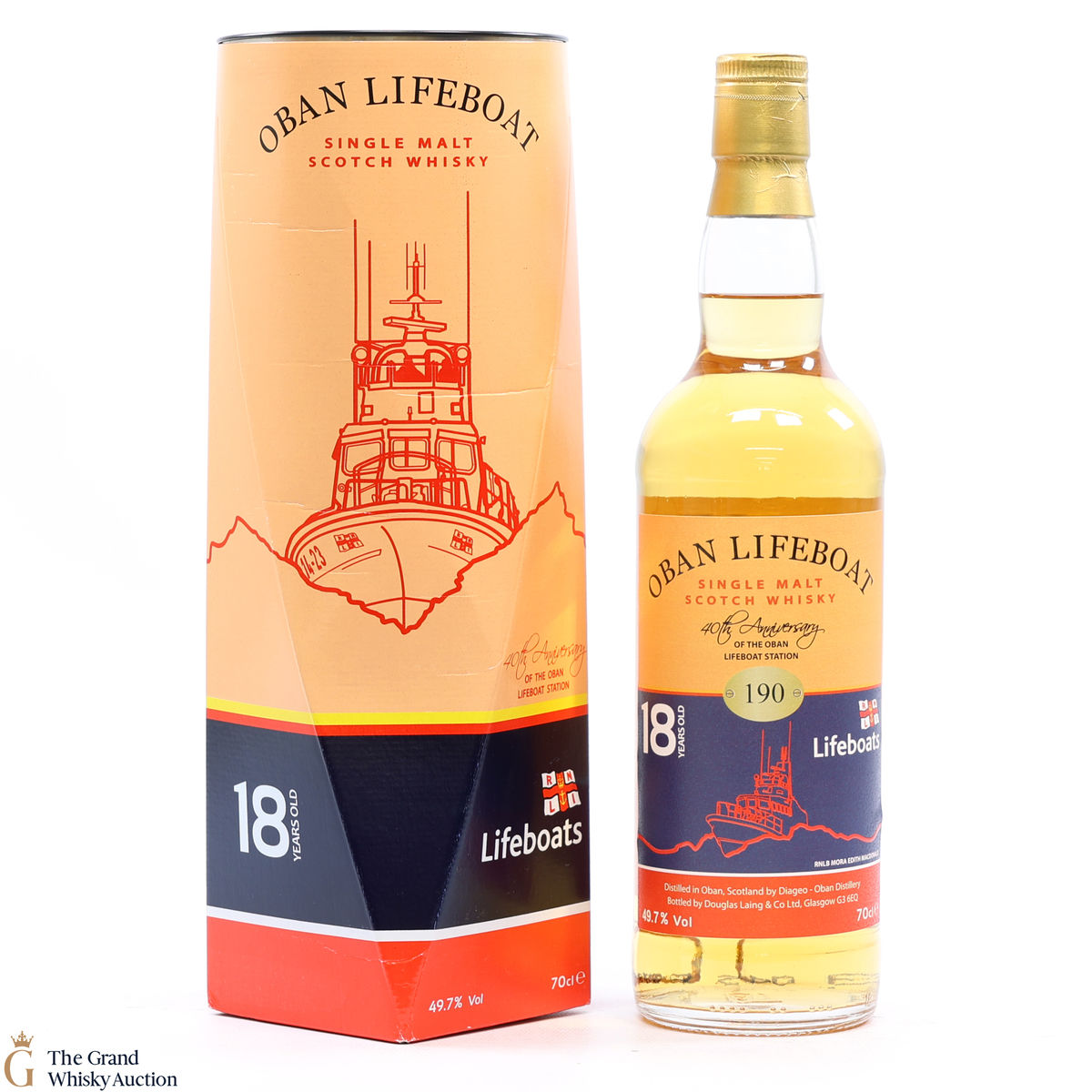 This is an 18-year-old Oban single cask malt whisky bottled by Douglas Laing. Bottled and released celebration of its 40th anniversary of Oban Lifeboat. station and to raise money.