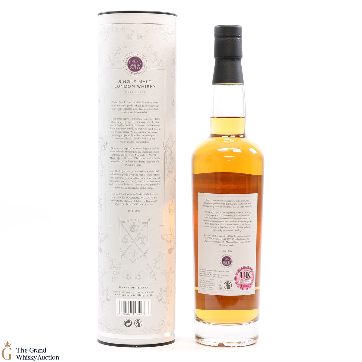 This Bimber limited edition small batch release celebrates the Platinum Jubilee of Queen Elizabeth II. Matured in ex-bourbon casks for four years before being bottled at a strength of 51.8% abv. One of 1,952 bottles.