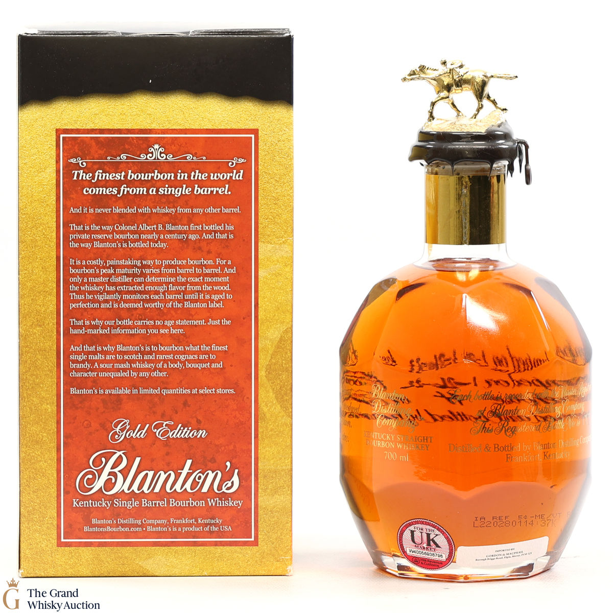 PLEASE NOTE: The wax seal on Blanton's bottles are prone to cracking in transit due to their design. Therefore, as stated in our T&C’s, we do not and will not accept liability should the seal be breached, broken, split or leak in transit. Additionally, please know due to the design of the internal cardboard packaging that surrounds the top of the bottles, it too may be torn. By bidding on this lot you have understood this to be true. Insurance is for complete breakage or loss in transit only.