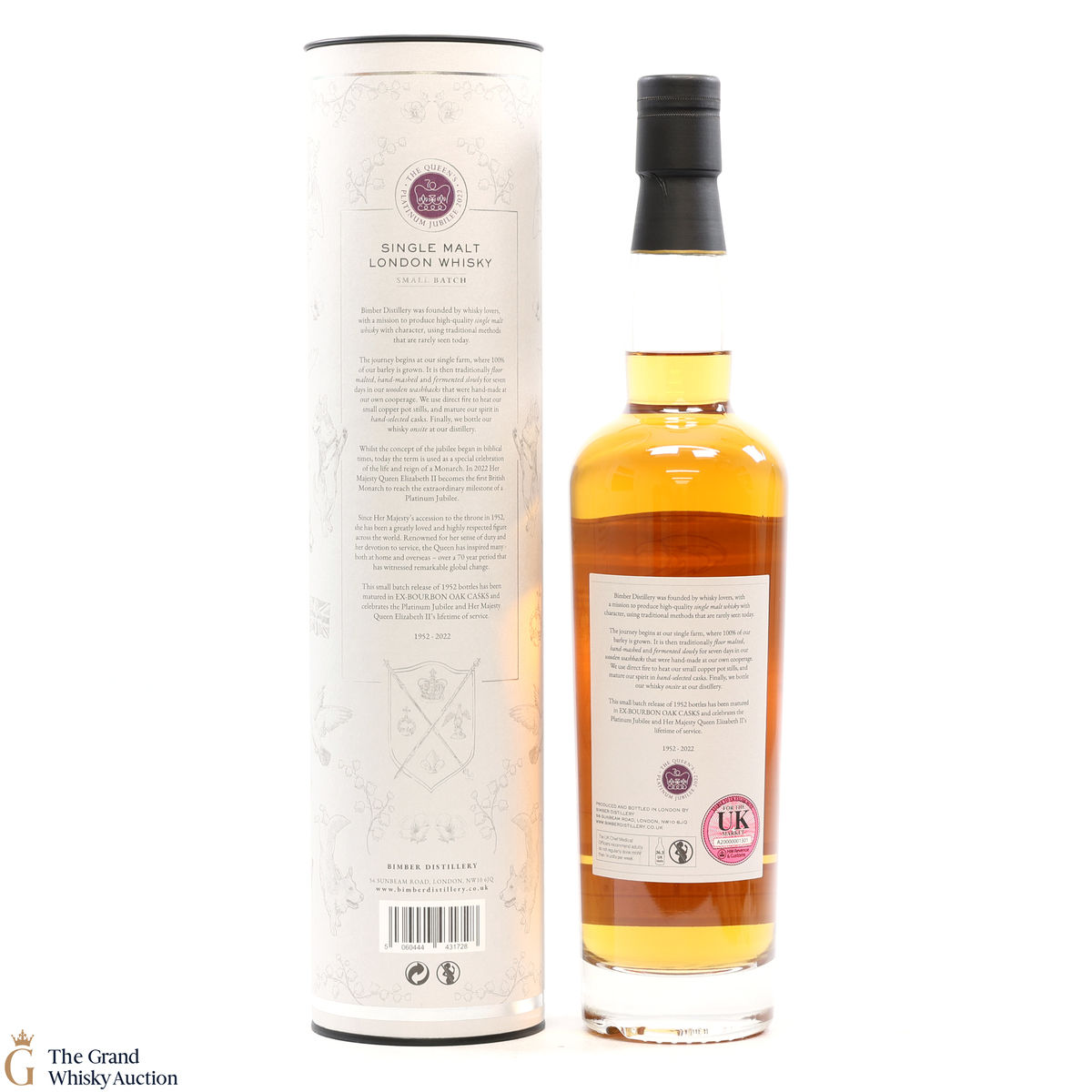 This Bimber limited edition small batch release celebrates the Platinum Jubilee of Queen Elizabeth II. Matured in ex-bourbon casks for four years before being bottled at a strength of 51.8% abv. One of 1,952 bottles.