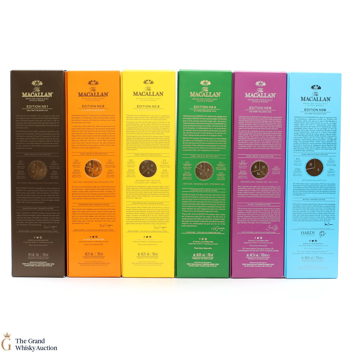 This lot brings together the Macallan Edition set to date, comprising of Edition no. 1, 2, 3 4, 5 & 6 in the annual limited edition series.