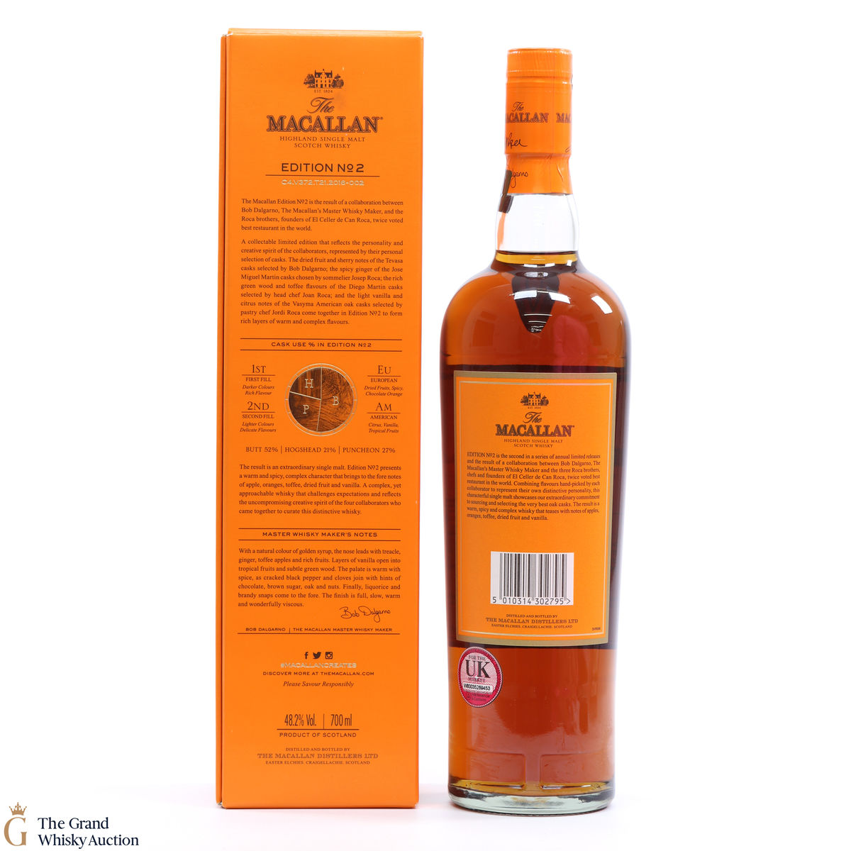 This is the second release from the Macallan Edition series. Edition No.2 is a collaboration between Macallan's master blender Bob Delgarno and legendary Spanish chefs Joan, Josep and Jordi Roca. The Rocas are the three brothers behind El Celler de Can Roca (named Best Restaurant in the World twice by Restaurant magazine). This single malt was drawn from a combination of sherry puncheons, butts and refill hogsheads.