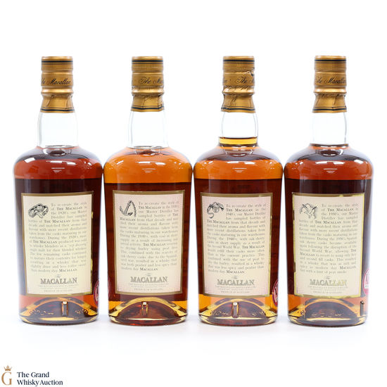 This lot includes a full set of the Macallan Travel Series: 1920s, 1930s 1940s & 1950s, each in their presentation boxes. 4 x 50cl.